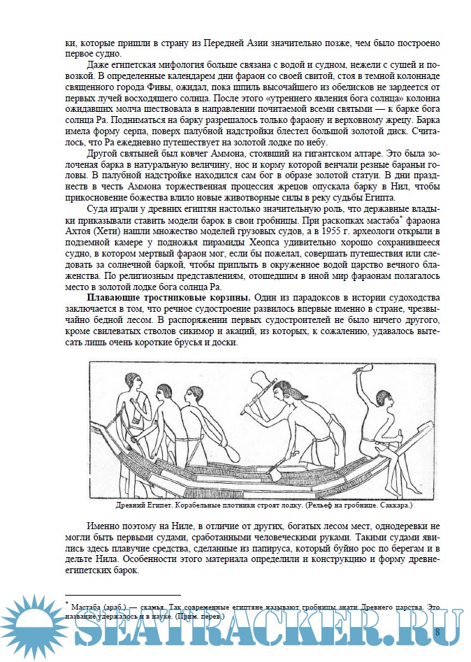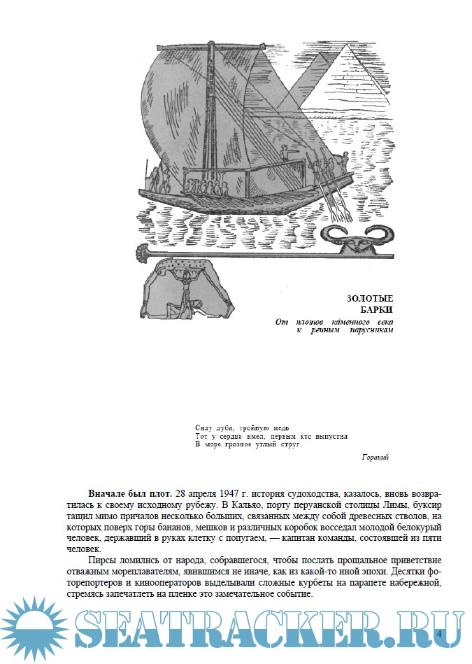Содержание Пролог Золотые барки От плотов каменного века к речным парусникам Рождение килевого судна 2500 лет назад у подножья Ливанских гор было сделано величайшее изобретение в истории судостроения Морские народы Атлантики и Тихого океана Викинга и полинезийцы - мореплаватели удивительного умения и отваги Белые паруса с черными крестами На каждом крестоносце венецианские судовладельцы зарабатывали до 1000 процентов Золото желанное - золото проклятое Кучка авантюристов бросает вызов Атлантике Пятнадцать человек на сундук мертвеца О мятежах, цинге, шанти, навигаций и флейтах Люди, перед которыми трепетало море Почему матросы носят черные галстуки Морские королевы Клиперы явились вершиной и концом героического века мореплавания Обессиленный пассат Паровая машина избавила моряков от боязни мертвых штилей Железная морская собака Плавание под водой начинается Под флагом насилия От морского разбоя к борьбе за господство на море Красное знамя на мачте То, что начали "кули кайзера", завершат их внуки Морские чудовища из стали и синтетики Большие танкеры уже перешагнули за 400 000 тонн Далеко под южным крестом Мореплаватель не отрывается больше от мира Города с килем и шпангоутами О плавучих дворцах, чудо-улицах, фабриках, товарных поездах и катафалках "Рю де ля Пэ" океана Внуки Пекода Морская охота потребовала создания специальных судов для ловли и обработки добычи Контейнеровоз производит революцию в морском транспорте Неустанно растущий мировой торговый флот специализируется и механизируется Странствующие пристани Растущая осадка судов превращает рейды в центры погрузки и разгрузки Судно преодолевает пространство Турбины в тысячи лошадиных сил и укорочение морских путей уменьшают земной шар Плавучие лаборатории, ныряющие блюдца Люди в белых халатах на воде и под водой Корабельные кладбища, пиратские сокровища, плавучие гробы Путешествие по затонувшим, терпящим бедствие и непотопляемым судам Механические рыбы На чем зиждется будущее судоходства Первые шаги по палубе От юнги до капитана дальнего плавания Спуск со стапеля в лифте Верфи превращаются в конвейеры без эллингов Приложения Указатель литературы