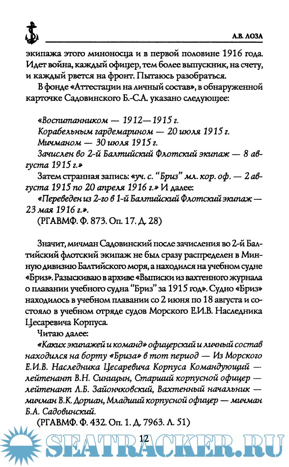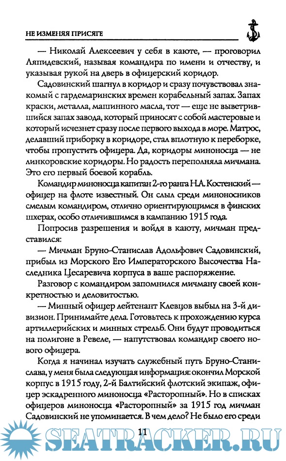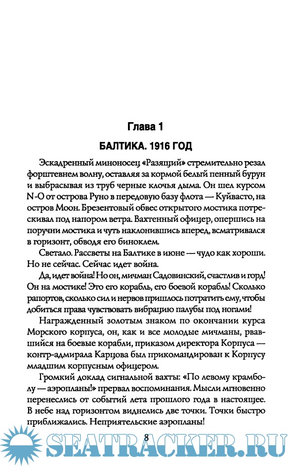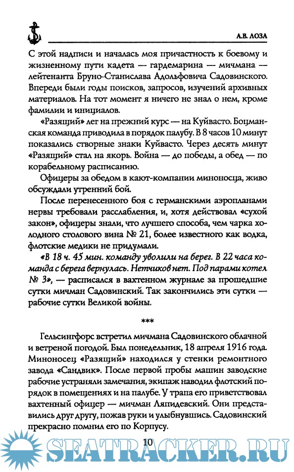 Описание: Книга морского офицера А.В. Лозы повествует о боевых действиях экипажей эскадренных миноносцев «Разящий» и «Расторопный» в войне с Германией в 1915—1916 годах на Балтике: о кровавом революционном выборе 1917 года: о трагической борьбе белых офицеров флота и. среди них. — судьбе лейтенанта Российского императорского флота Бруно Садовинского на Севере в период 1918—1920 годов. В его судьбе, как в капле воды, отразились самые трагические периоды в истории страны — Первая мировая война и революционные перевороты, гибель офицеров и крушение Российского флота, создание белых флотилий и эскадр, жестокая Гражданская война... Он не изменил присяге и принял мученическую смерть!
