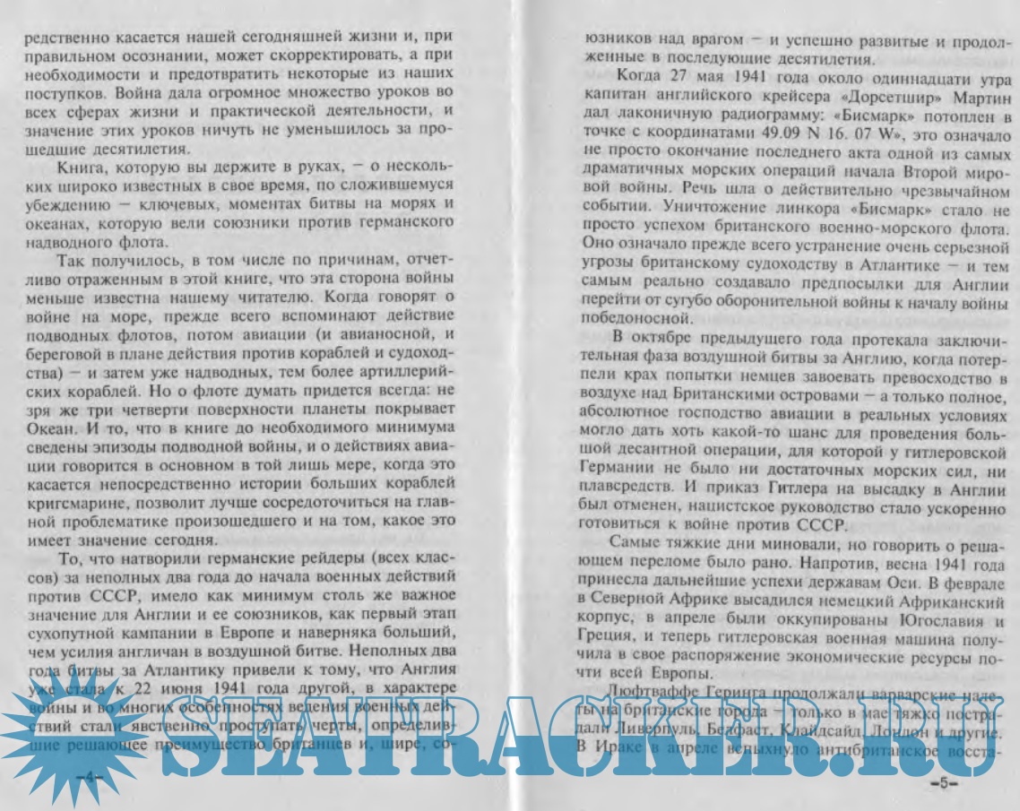 Год выпуска: 2002 Язык: Русский Автор: Кубатько Игорь Игоревич Жанр: Историческое Издательство: Русич Формат: DjVu Качество: Отсканированные страницы Количество страниц: 440 Описание: Некоторые драматичные страницы войны на море во время Второй мировой войны слабо освещены в отечественной литературе. Создав мощный военно-морской флот, фашистская Германия бросила вызов `владычице морей` - Великобритании. Британскому Адмиралтейству пришлось приложить отчаянные усилия, чтобы нейтрализовать, а затем и устранить опасность, исходившую от германских линкоров и крейсеров. Именно об этом, о потоплении `Бисмарка` и охоте на `Тирпиц`, о морских сражениях, героизме моряков и трагедии людей, ставших заложниками преступной политики, рассказывают авторы этой книги.