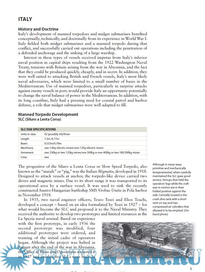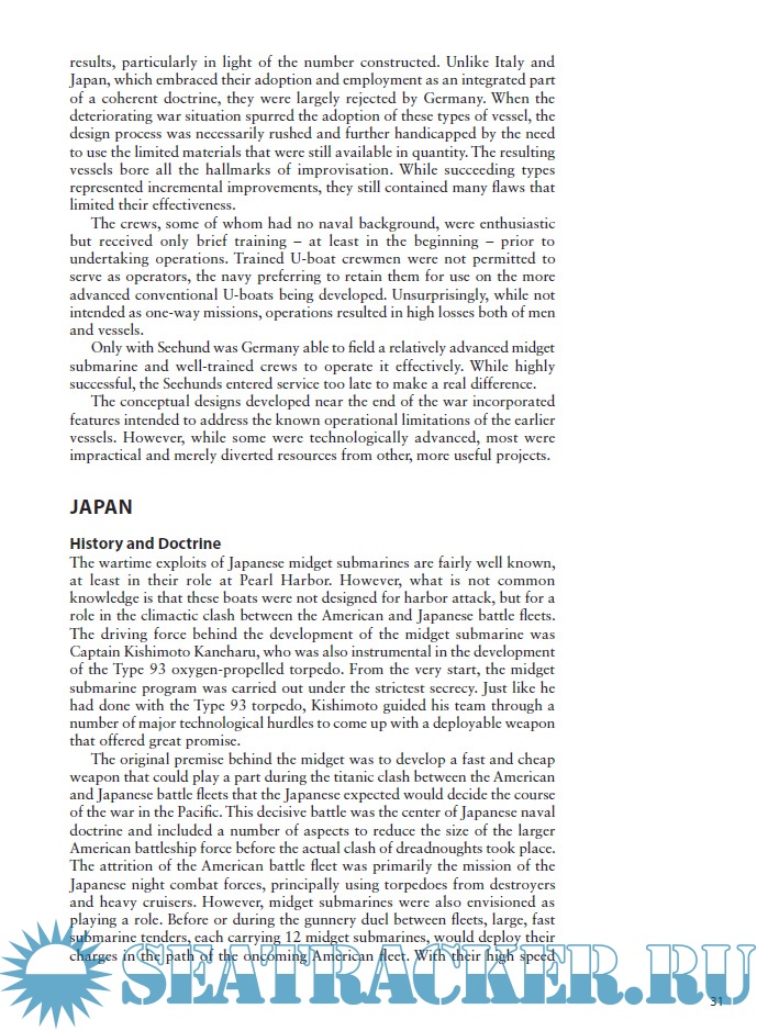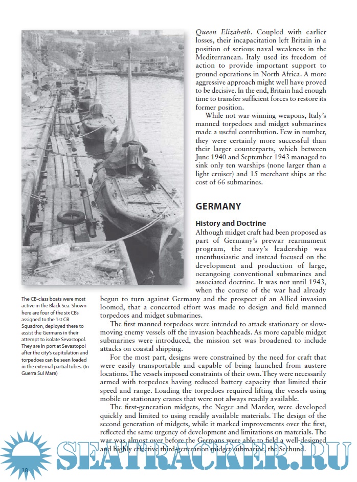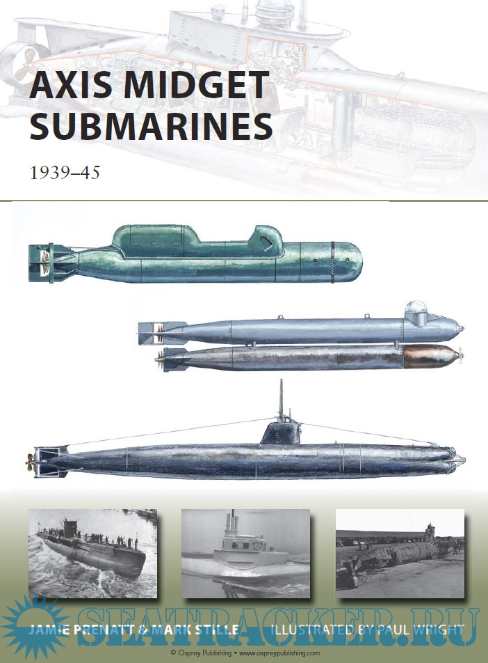 Year: 2014 Language: English Author: Jamie Prenatt, Mark Stille Genre: Historical Publisher: Osprey Publishing Edition: New Vanguard 212 Format: PDF Quality: eBook Pages count: 50 Description: Axis Midget Submarines details the history, weapons, and operations of German, Japanese, and Italian midget submarines during World War II. Over this period, Germany, Japan, and Italy built approximately 2,000 small, inherently stealthy, naval craft to perform special operations and conventional navy missions. Much more numerous and more technically advanced than their Allied counterparts, they saw service worldwide, operating in the Pacific, Mediterranean, Black Sea, Indian Ocean, North Sea, and the English Channel. Manned by courageous crews, these vessels made daring attacks on Allied ships in heavily protected anchorages using torpedoes and mines. Most notable were attacks against Gibraltar - launched from an Italian cargo vessel interred in nearby neutral Spain that had been converted into a clandestine support base and equipped with an underwater hatch - and Pearl Harbor. They were used against shipping in coastal waters and, near the end of the war, in desperate attempts to offset their opponents' overwhelming naval superiority during the US advance across the Pacific and the Allied amphibious landings in France and Italy. In this book, the term midget submarine includes submarines of less than 50 tons, equipped with two torpedoes and a crew of 1-4, and manned torpedoes, relatively short range torpedo-size craft with one or two operators and armed with either mines or one torpedo. It excludes vessels designed as suicide craft. It addresses operational vessels and prototypes, spanning 11 German, 4 Japanese, and 5 Italian classes. The most advanced types incorporated innovative design features and served as the basis for a number of post-war vessels. This book also briefly covers the larger vessels used to transport the midget submarines to their operational areas. Also included is an analysis of the effectiveness of these vessels, including an examination of their strengths and weaknesses. The success (or lack of success) will be discussed both in the context of the individual vessel design and as a component of their respective nation's submarine force. They are also compared to similar Allied designs.