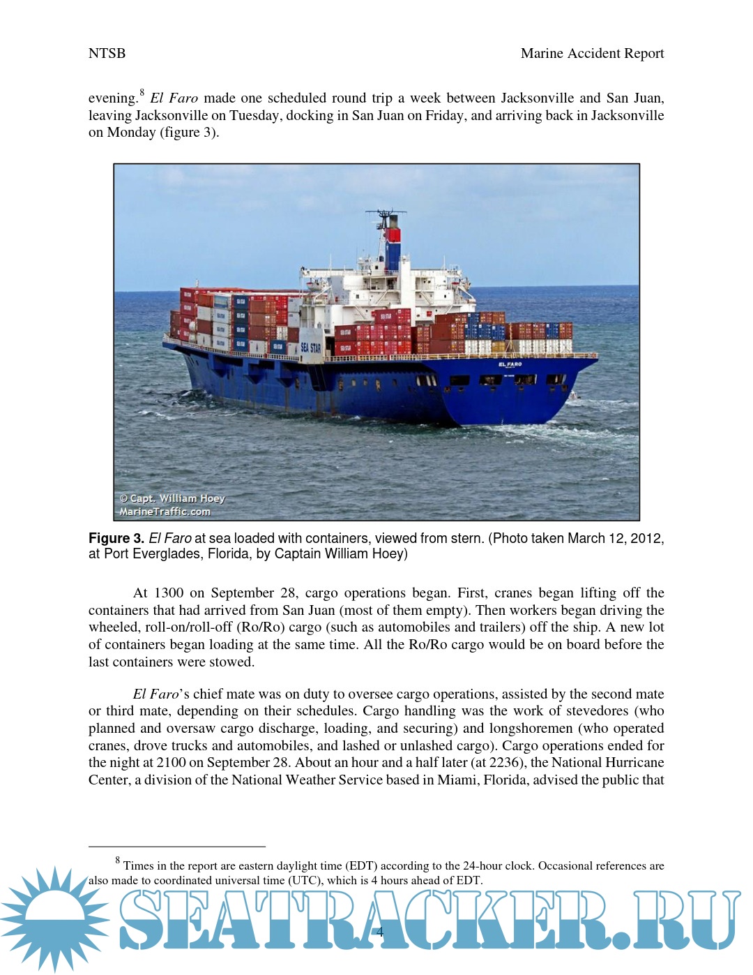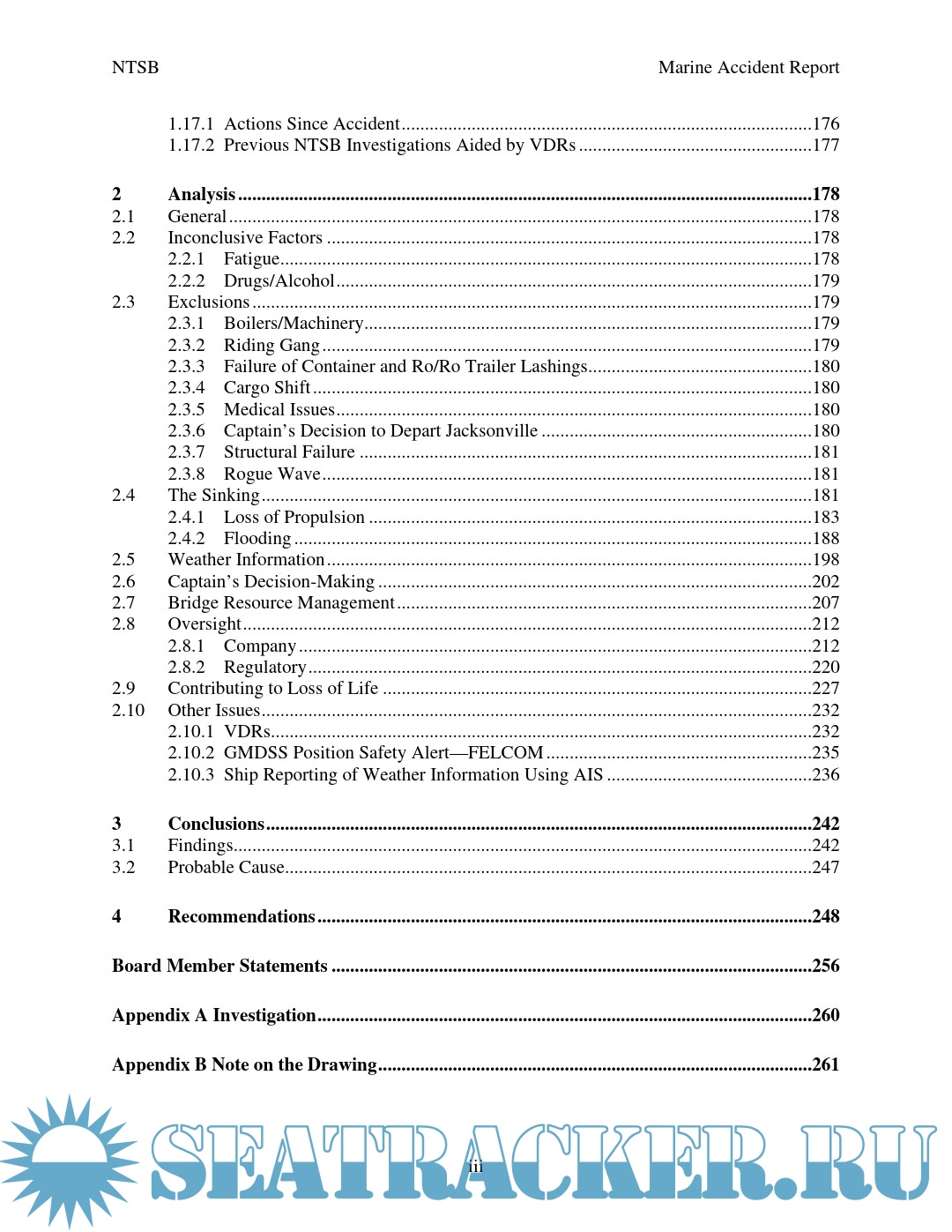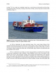 Description: On Thursday, October 1, 2015, the SS El Faro, a 40-year-old cargo ship owned by TOTE Maritime Puerto Rico and operated by TOTE Services, Inc., was on a regular route from Jacksonville, Florida, to San Juan, Puerto Rico, when it foundered and sank in the Atlantic Ocean about 40 nautical miles northeast of Acklins and Crooked Island, Bahamas. The ship had sailed directly into the path of Hurricane Joaquin, carrying a crew of 33, including 5 Polish contract repair workers. All those aboard perished in the sinking. As part of its accident investigation, the National Transportation Safety Board (NTSB) led a joint effort with the US Navy, Woods Hole Oceanographic Institution, and the National Science Foundation to locate the ship’s wreckage and retrieve its voyage data recorder (VDR). The VDR was pulled from 15,250 feet below the ocean surface in August 2016 during the third undersea mission and yielded more than 26 hours of parametric data and audio files. The NTSB’s accident investigation identified the following safety issues: captain’s actions, use of noncurrent weather information, late decision to muster the crew, ineffective bridge resource management, inadequate company oversight, company’s safety management system, flooding in cargo holds, loss of propulsion, downflooding through ventilation closures, need for damage control plan, and lack of appropriate survival craft. The NTSB made safety recommendations to the US Coast Guard; the Federal Communications Commission; the National Oceanic