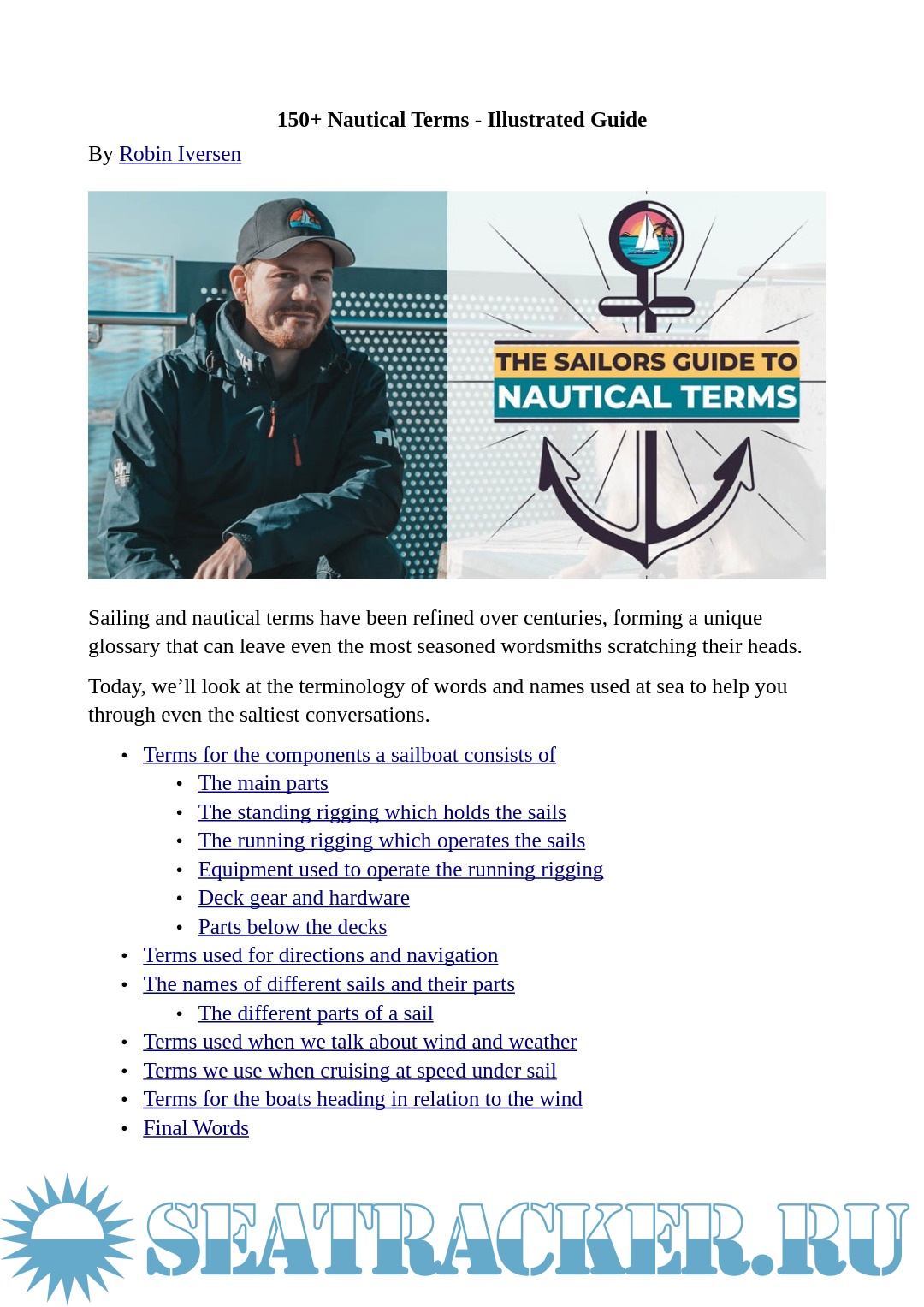 Year: 2024 Language: English Author: Iversen R. Genre: Dictionary Publisher: Iversen R. Format: PDF, DOCx Quality: eBook Pages count: 21 Description: Sailing and nautical terms have been refined over centuries, forming a unique glossary that can leave even the most seasoned wordsmiths scratching their heads. Today, we’ll look at the terminology of words and names used at sea to help you through even the saltiest conversations.