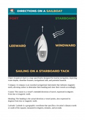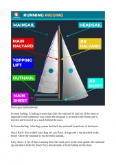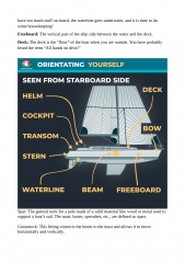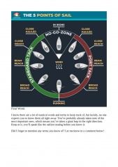 • Terms for the components a sailboat consists of ◦ The main parts ◦ The standing rigging which holds the sails ◦ The running rigging which operates the sails ◦ Equipment used to operate the running rigging ◦ Deck gear and hardware ◦ Parts below the decks • Terms used for directions and navigation • The names of different sails and their parts ◦ The different parts of a sail • Terms used when we talk about wind and weather • Terms we use when cruising at speed under sail • Terms for the boats heading in relation to the wind • Final Words