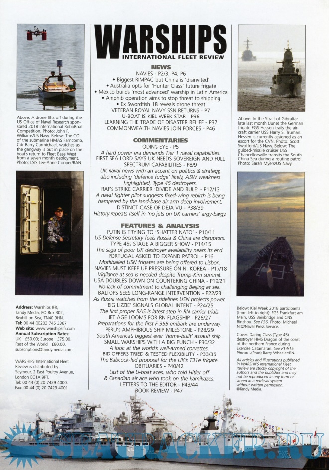 Year: 2018 Language: English Author: Iain Ballantyne (Editor) Edition: 2018-8 Format: PDF Quality: eBook Pages count: 47 Description: Warships IFR puts the spotlight on the latest developments in the world’s navies. It covers current defence issues and has comments by leading analysts. The magazine regularly includes features on the Royal Navy and the US Navy in addition to incorporating news and features on all other navies across the globe. Warships IFR frequently carries in-depth articles on naval heritage.WARSHIPS International Fleet Review is published 12 times a year by Tandy Media Ltd who also publish Shipping Today & Yesterday (which provides news and features from the world of merchant shipping).