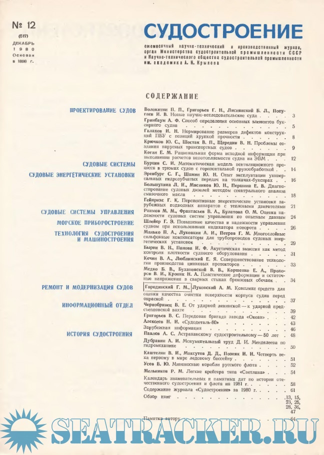 Год выпуска: 1980 Язык: Русский Автор: группа авторов Жанр: Периодическое издание (журнал) Издание: 1980-12 Формат: DjVu Качество: Отсканированные страницы Количество страниц: 69 Описание: В журнале публикуются статьи ученых и специалистов на темы, связанные с проектированием, постройкой, ремонтом, модернизацией и утилизацией военных кораблей, гражданских судов. Регулярно выходят в свет работы, посвященные организации и технологии судостроительного производства, проектированию верфей и доков, новым судостроительным материалам. Большое внимание уделяется вопросам судовой энергетики и новым разработкам в области морской техники.