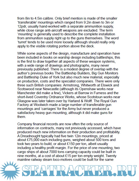 Although the impact of the book is largely visual, there is an expert account of the design, construction and installation of such mountings, and their manufacturers, supported by a range of internal and close-up photographs. The reference value of the work is enhanced by a comprehensive table of mountings and their characteristics, plus a list of all the mountings made by Vickers of Barrow between 1900 and 1950.