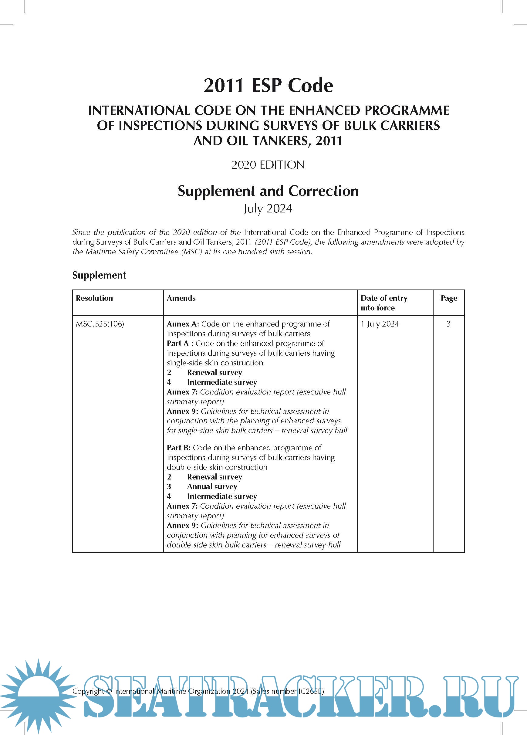 2. 2011 ESP Code International Code on the enhanced programme of inspections during surveys of bulk carriers and oil tankers, 2011 2020 Edition Supplement and Correction July 2024