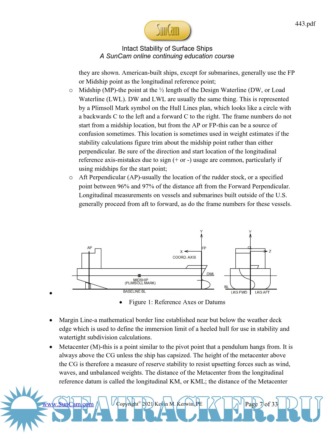 Year: 2021 Language: English Author: Kerwin K.M. Genre: Technical Publisher: SunCam Format: PDF Quality: eBook Pages count: 33 Description: Intact stability is a fundamental part of the calculations for a ship that the Naval Architect does. Fortunately, the calculations are done using specialized computer programs these days, but even the American standard, GHS, could use some updating to the 21st century. Stability is the ability of a ship to float properly upright in an equilibrium position, at a draft no more than her assigned maximum waterline, and to resist external forces such as normally expected waves and wind while doing so.