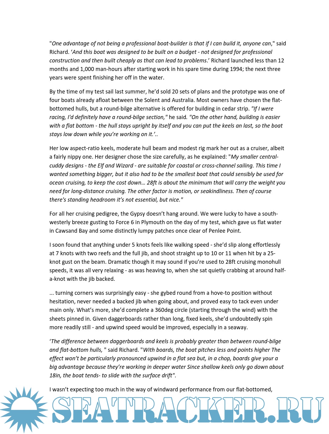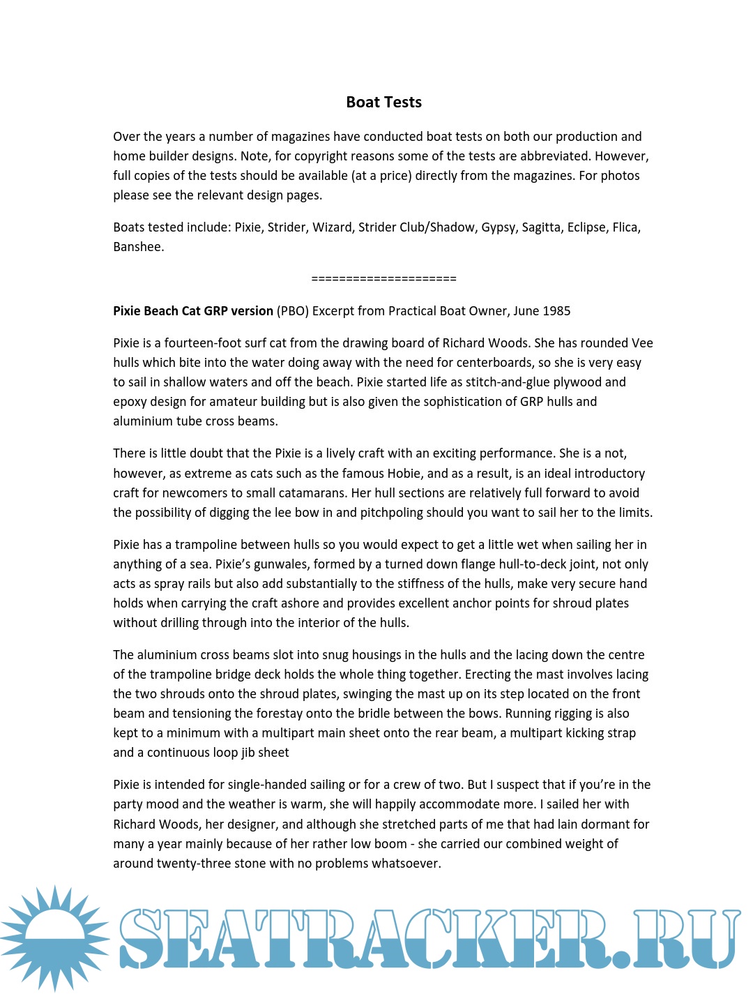 Description: Over the years a number of magazines have conducted boat tests on both our production and home builder designs. Note, for copyright reasons some of the tests are abbreviated. However, full copies of the tests should be available (at a price) directly from the magazines.