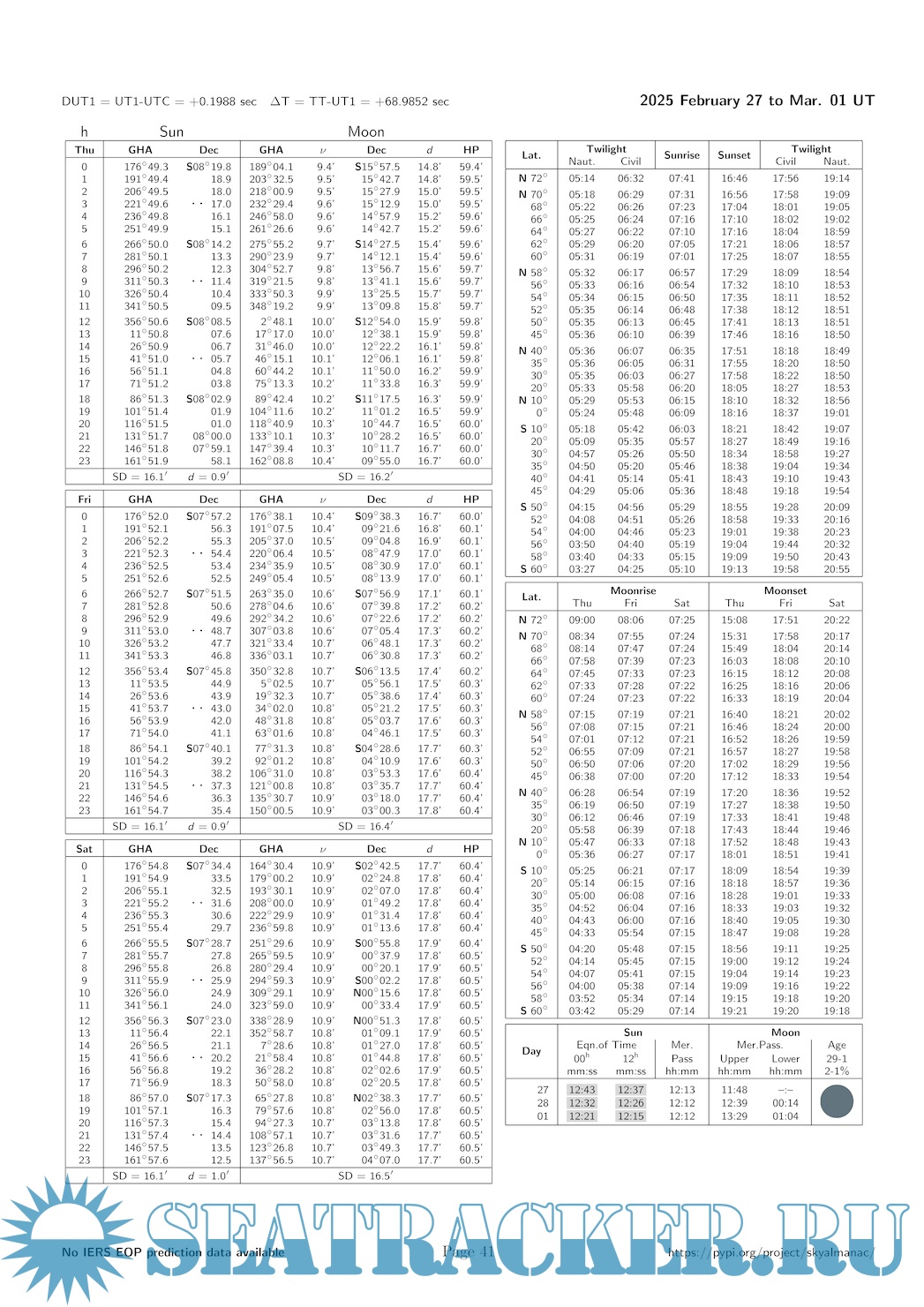 Year: 2024 Language: English Author: Capt. Roberto Iori Genre: Reference book, Periodical publication Publisher: TheNauticalAlmanac Edition: 2025 Format: PDF Quality: eBook Pages count: 293 Description: The Nautical Almanac world's most complete source of free celestial navigation information. The Nautical Almanac was originally created from PyAlmanac written by the great Norwegian sailor Enno Rodegerdts. PyAlmanac used PyEphem to generate the almanacs and LaTex provided the final formatting.