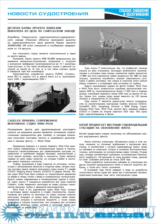 Описание: ''Судовое снабжение и обслуживание'' периодический информационный бюллетень, издается с 1999 года и в настоящее время по праву занимает одно из ведущих мест среди специализированных отраслевых печатных изданий.Бюллетень стал надежным маркетинговым инструментом для технического менеджмента судостроительных, судоремонтных и снабженческих компаний. Более 500 отечественных и зарубежных фирм рекламодателей успешно сотрудничают с журналом с целью расширения своего бизнеса.Бесспорным преимуществом является бесплатное распространение издания целевой адресной рассылкой: судостроительным и судоремонтным предприятиям; морским и речным портам; судовладельцам морского, речного, промыслового флота; производителям и поставщикам судового оборудования, снабжения и материалов; предприятиям обслуживания флота (всего более 9000 компаний РФ). В журнале представлен весь спектр судового оборудования, комплектующих, запчастей, снабжения и материалов (с указанием контактных данных фирм производителей и поставщиков).