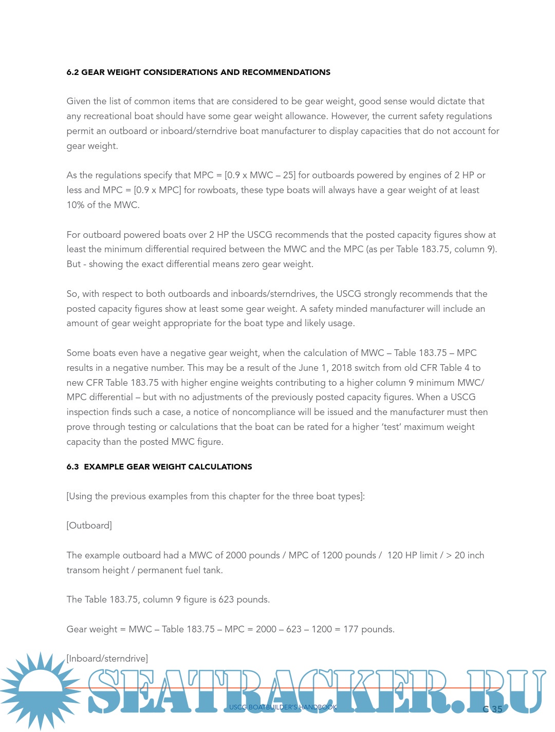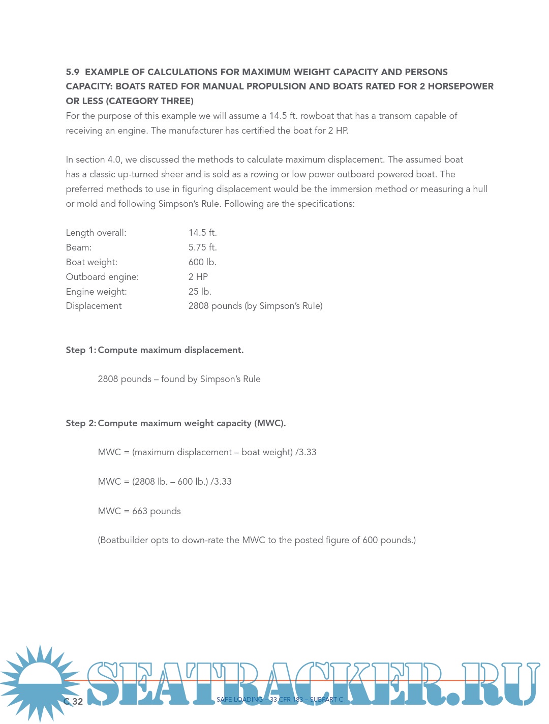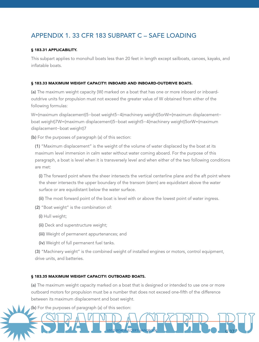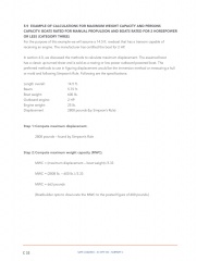 Description: INTRODUCTION Boatbuilders are responsible to determine the capacity figures placed on their monohull boats of less than 20 feet in length. The previous guideline (Display of Capacity Information) has covered the manner in which the capacity and powering figures are to be shown on the USCG capacity label. The ‘Powering’ guideline covers the manner to establish an upper powering limit. This ‘Safe Loading’ guideline covers the maximum capacity and persons capacity lines on the USCG capacity label. It discusses the methods for a boatbuilder to test for or calculate the upper limit for weight capacity and persons capacity, both in terms of pounds and in a whole number of persons.