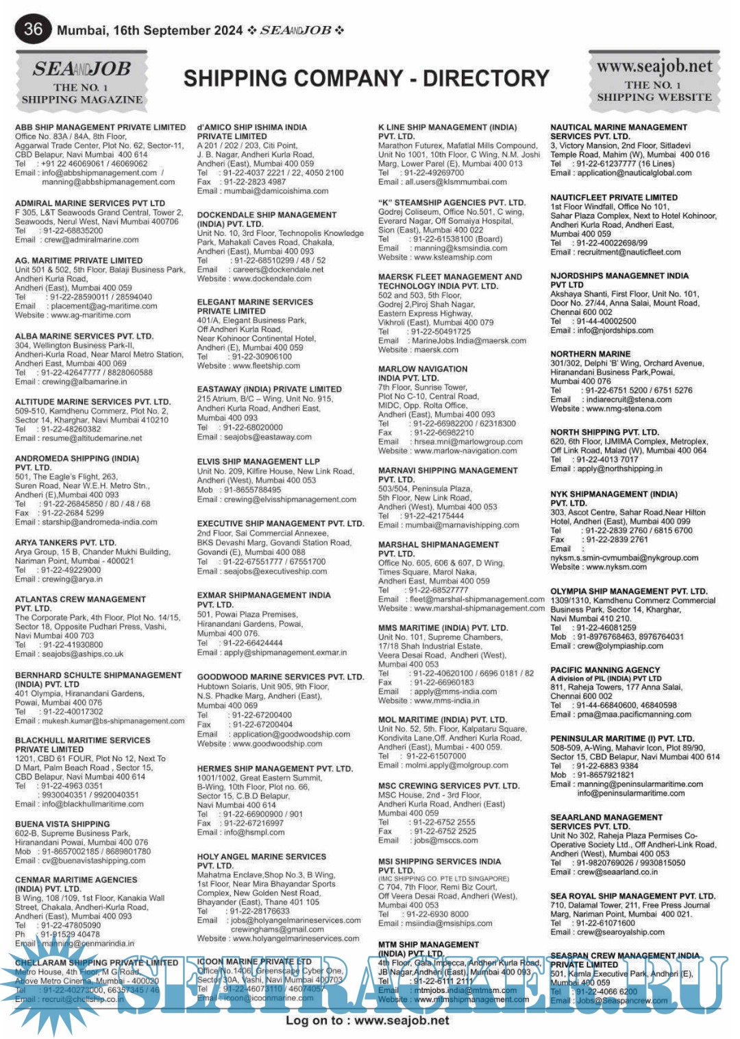 Description: The Sea and Job magazine launched in May 2007, was the second venture of Sea Line Group succeeding 'seajob.net' bringing the much renowned essence to the Group, the Sea and Job Magazine quickly gained popularity, becoming the No. 1 Shipping Magazine that came to be widely circulated all over India.Sea and Job over the years has evolved as the most trusted, ethical, objective and read maritime publication that possesses a large database of subscribers from various verticals in the industry.The magazine provides informative and interesting articles covering not just the shipping world but also the world outside it. Sea and Job is also a medium for the shipping/ manning companies to advertise marine jobs and also to promote their organization by publicizing internal activities like seminars, sports events and parties.Some notable endeavors of the magazine include the Know Your Recruiter Column, the Sailing Episodes Column and the Marine Insights section. The consistent efforts and the dedication to provide extraordinary services to the industry has resulted in the magnifying popularity and patronage of Sea and Job.