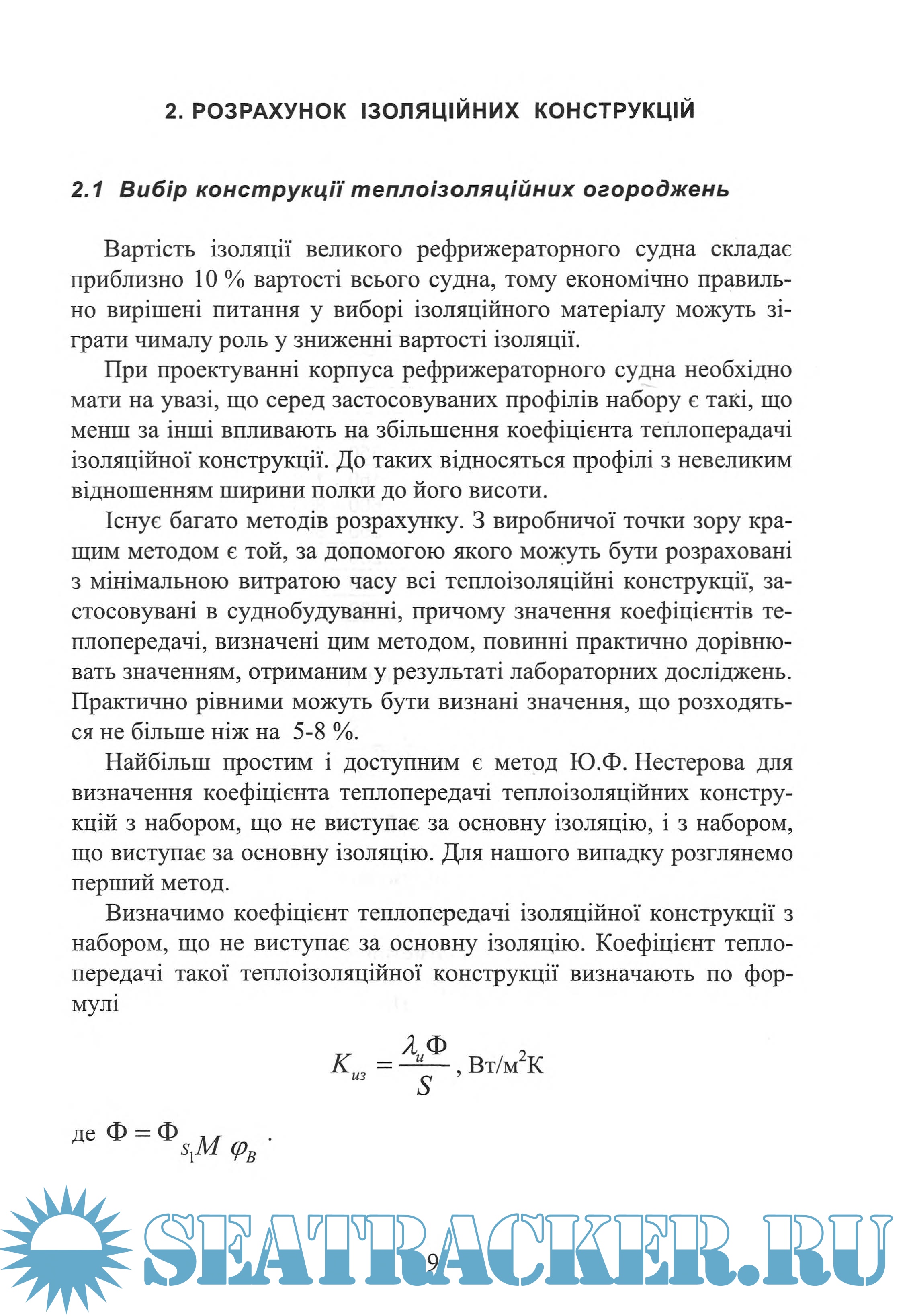 Розглядаються холодильні агенти і холодоносії, вимоги до них, фізичні властивості; вибір конструкції теплоізоляційних огороджень і визначення коефіцієнта теплопередачі для кожного ізольованого огородження з використанням його надалі при розрахунку теплопритоків в охолоджувані приміщення. Дано методику розрахунку теплопритоків і таблиці, куди зводять його результати. Дані також вибір способу і системи охолодження, після чого виконується розрахунок і підбір основних і допоміжних елементів холодильної установки, характеристики яких наводяться в таблицях. Розглянуто різні принципові схеми суднових холодильних установок.