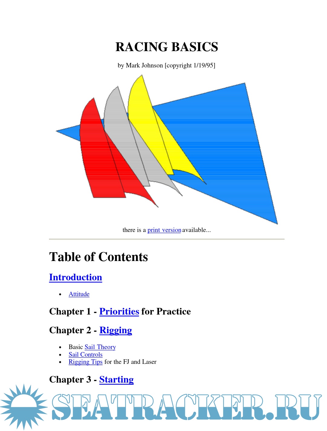 Year: 1995 Language: English Author: Johnson M. Publisher: Mark Johnson Format: PDF Quality: eBook Pages count: 55 Description: This guide is a detailed introduction to the sport of sailboat racing. It focuses particularly on intercollegiate racing in dinghies, such as the FJ and the Laser. However, the ideas can be applied to other boats, including keelboats, windsurfers, and iceboats. When a sailor begins to race, many questions come up, such as, "How do the sails work," "Why do I always get passed on the mark roundings," and "What's a mark rounding?" You can answer many of these questions by poring over various texts on aerodynamic theory and tactics manuals. In fact, that's one of the best ways to improve your knowledge about the sport in a thorough and detailed way.