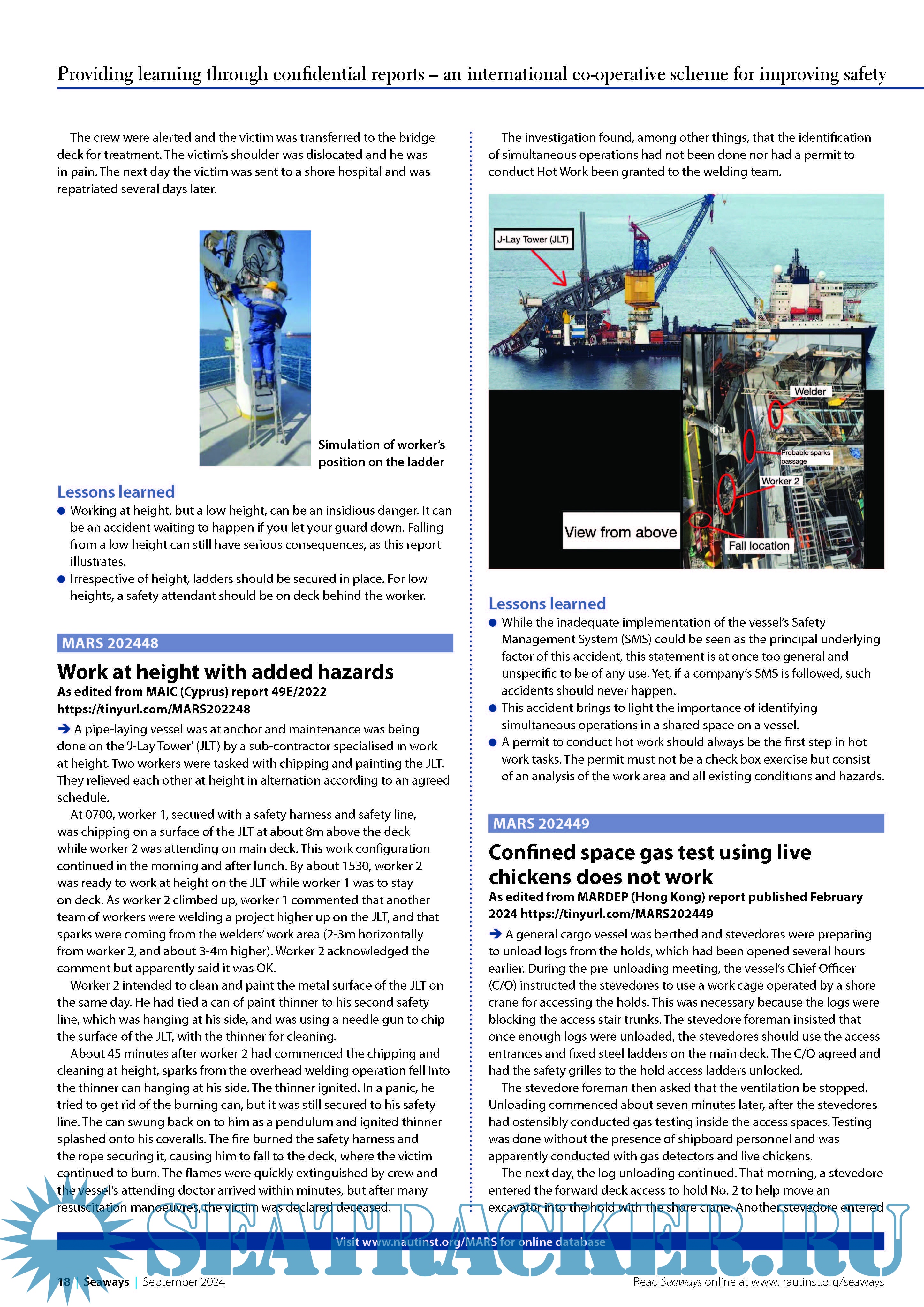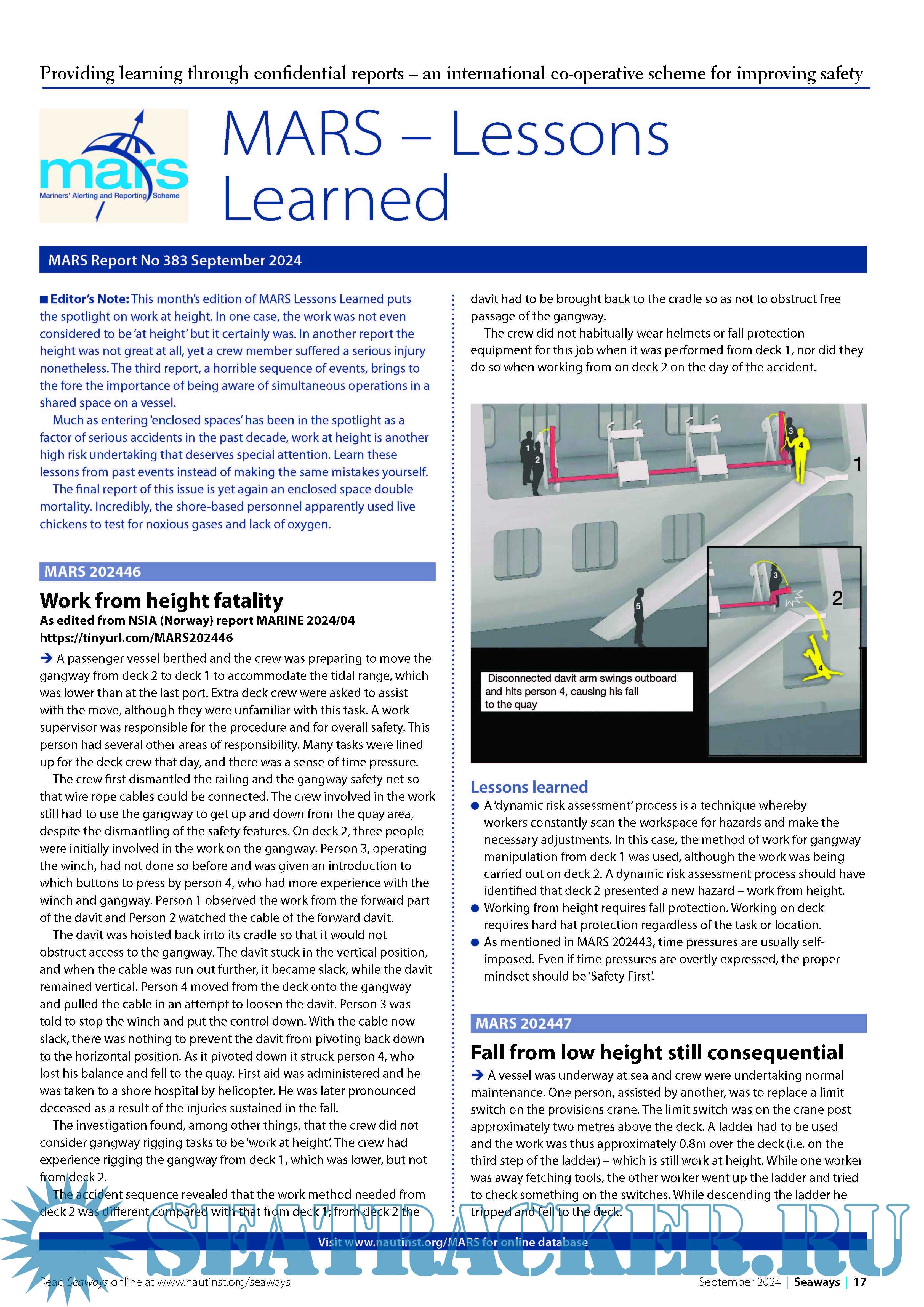 Year: 2024 Language: English Author: The Nautical Institute Genre: Periodical publication Publisher: The Nautical Institute Edition: issue No.383 September, 2024 Format: PDF Quality: eBook Pages count: 4 Description: Providing learning through confidential reports an international co-operative scheme for improving safety. MARS is a searchable database containing reports of accidents and near misses stretching back over a quarter of a century. Funded through the generous support of the Institute's Nautical Affiliate partners, it is one of the maritime industry's leading risk reduction initiatives and is helping to make life safer for seafarers everywhere.