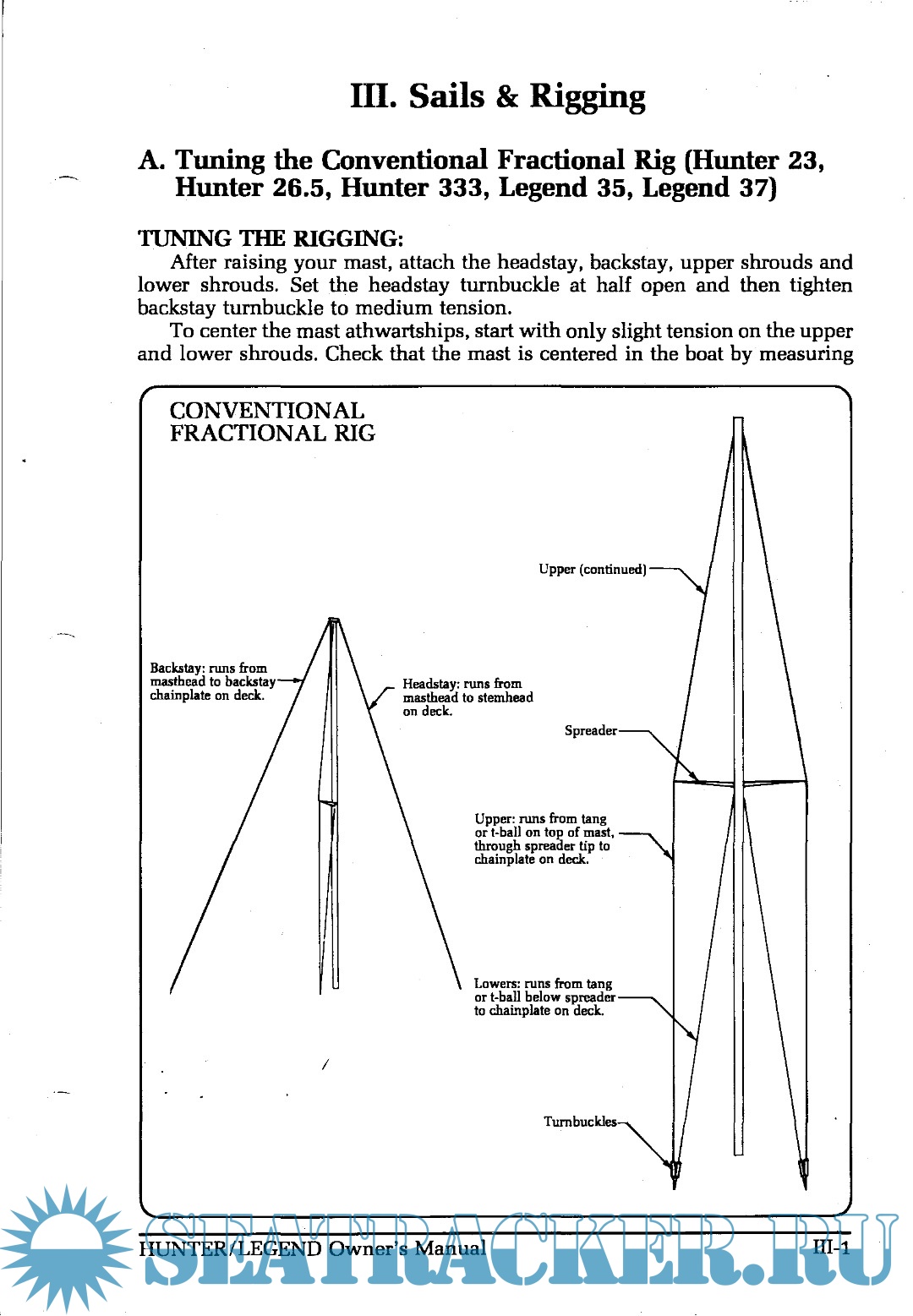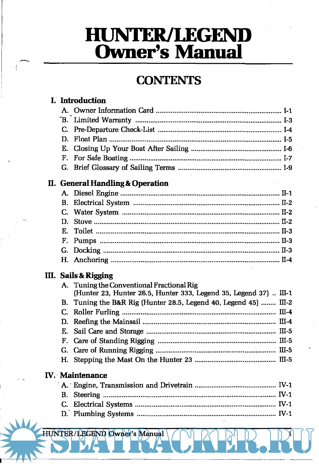 Description: The document is the owner's manual for a Hunter brand sailing yacht. It includes sections on general handling and operation of the yacht, maintenance requirements.