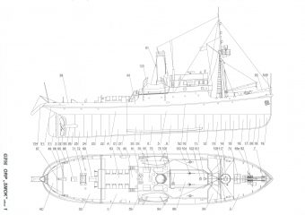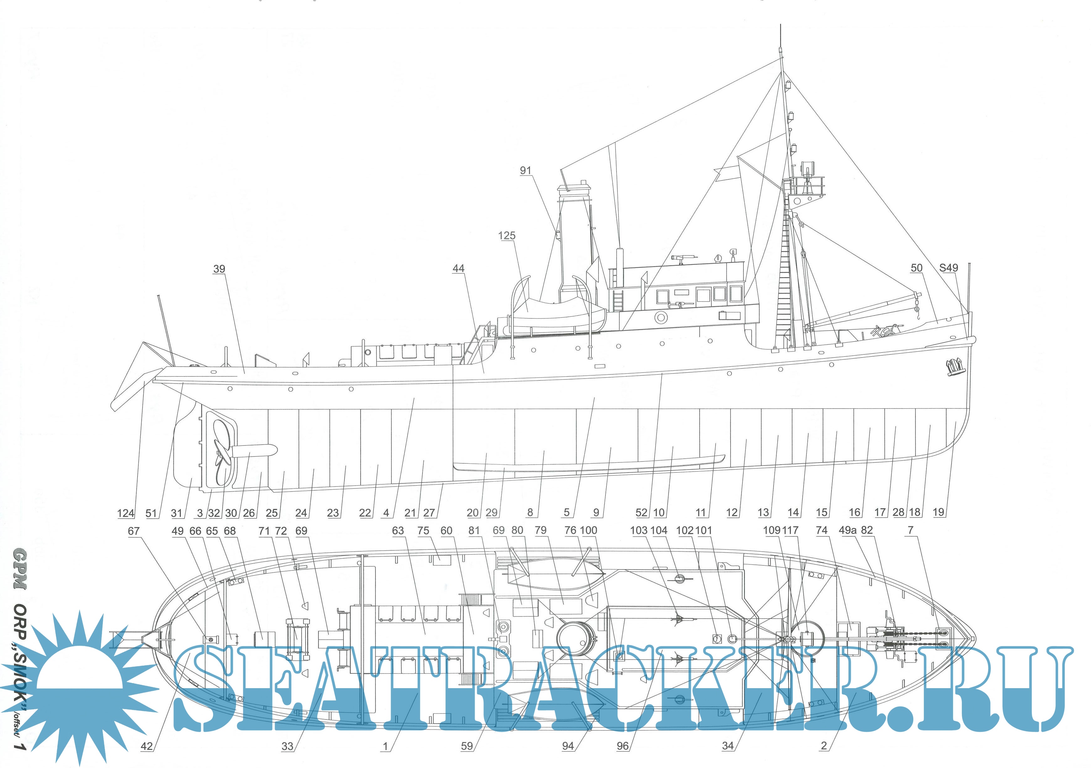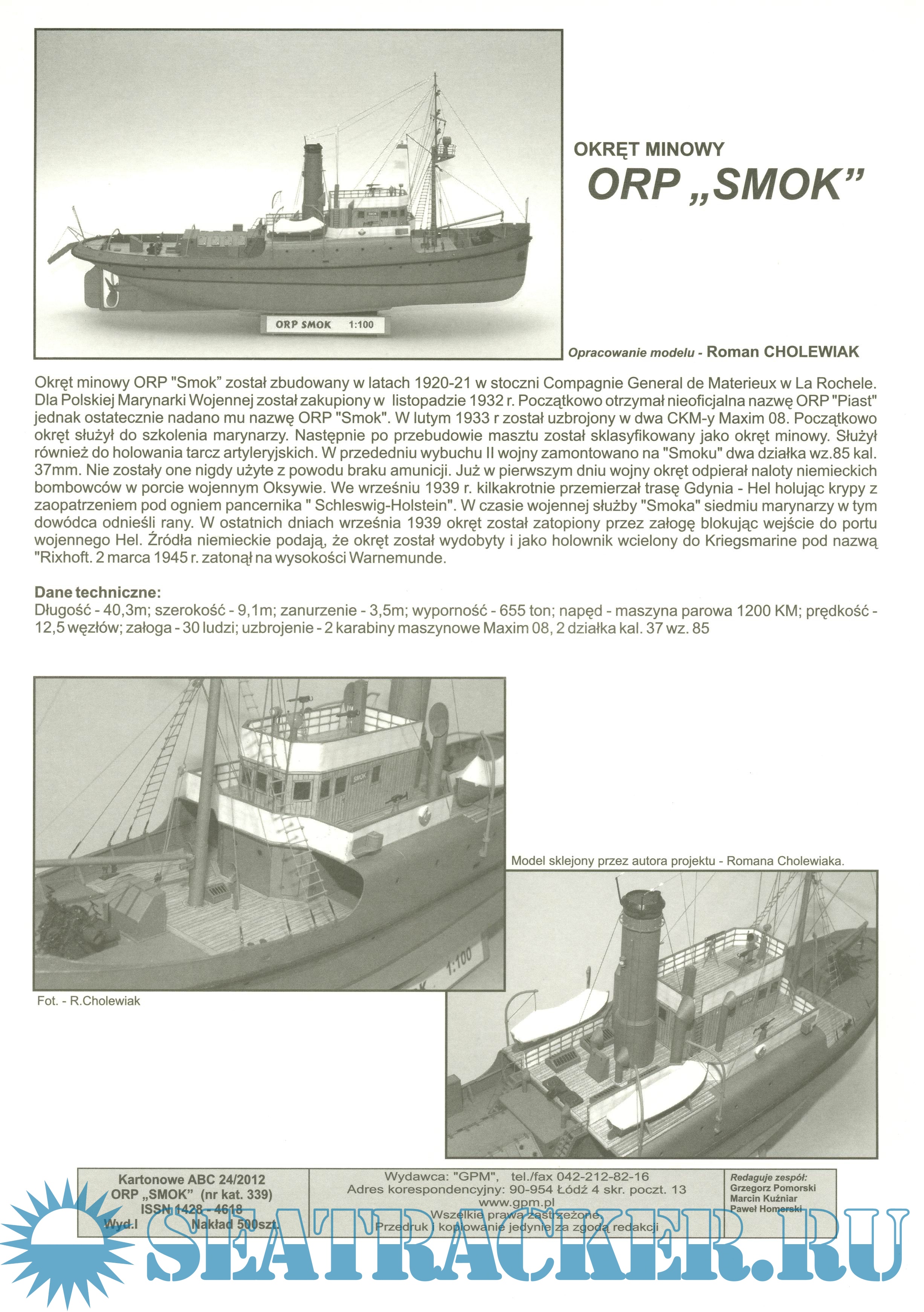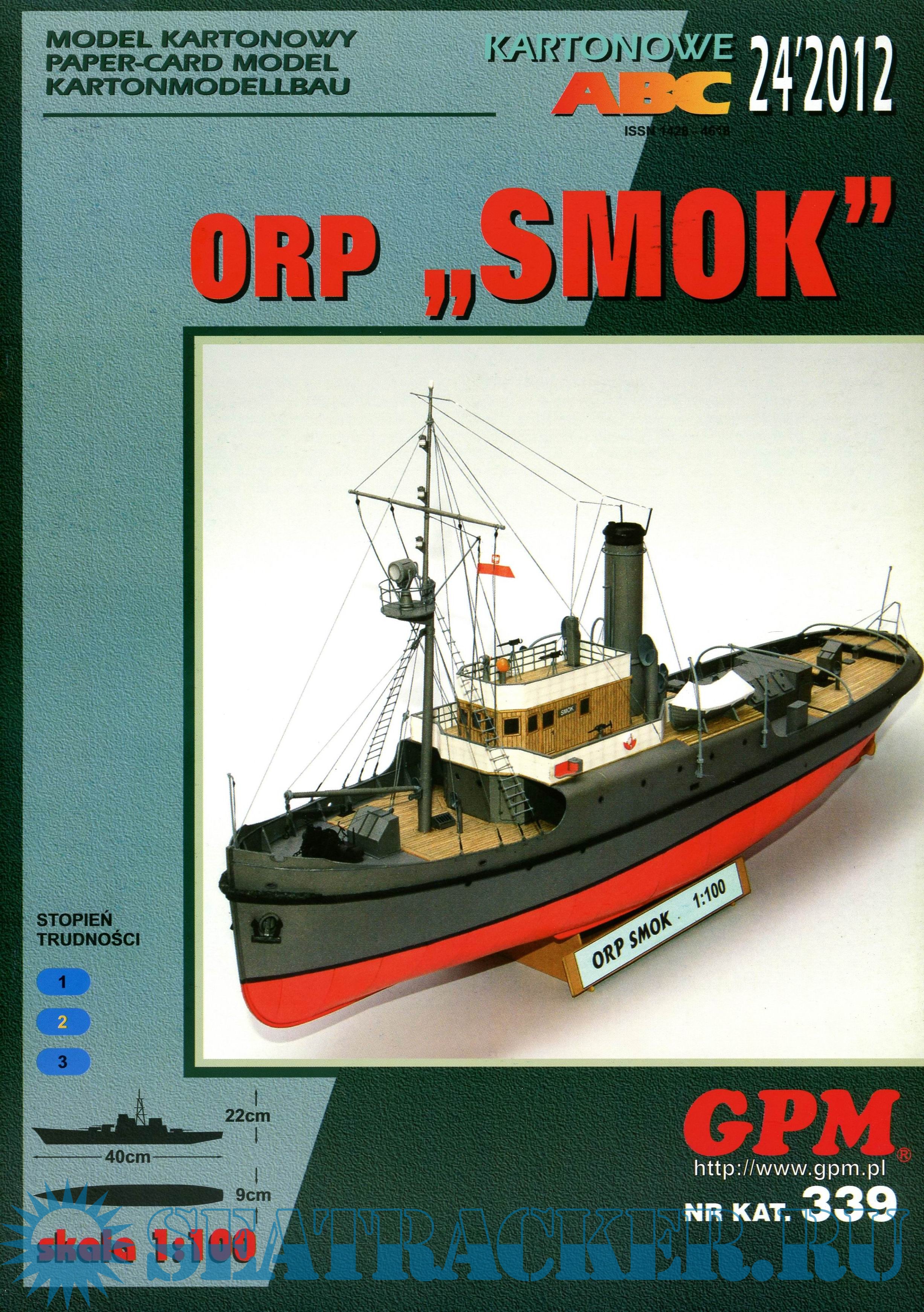 25 листов цветных выкроек и инструкций для изготовления бумажной модели польского буксира ORP Smok в масштабе 1:100