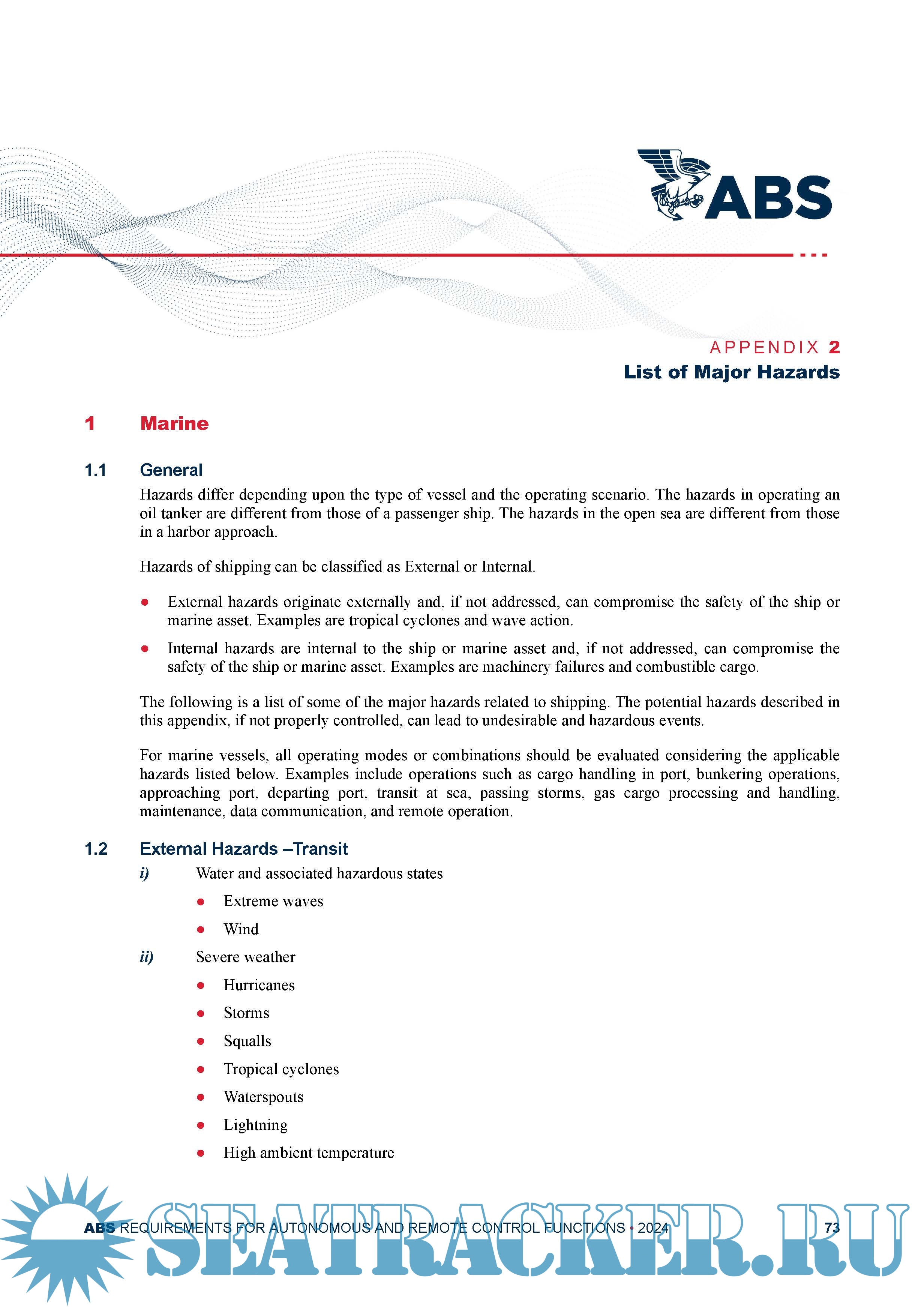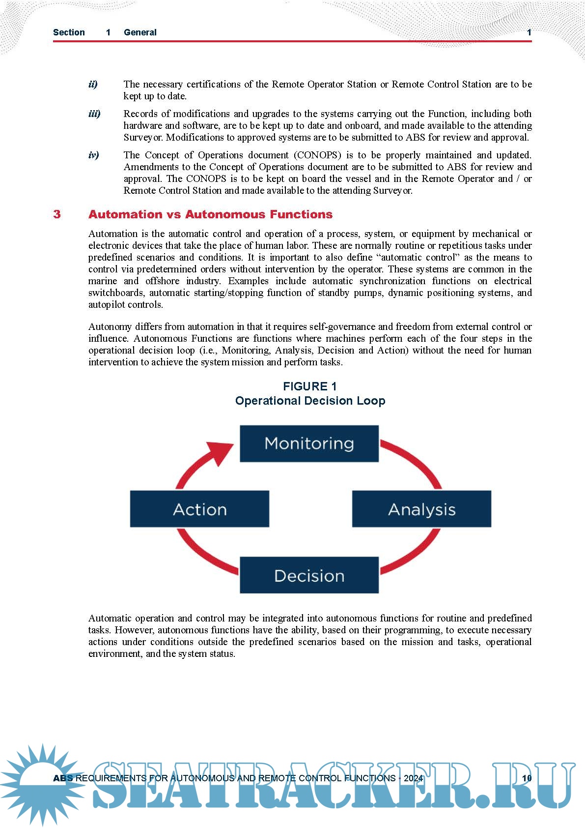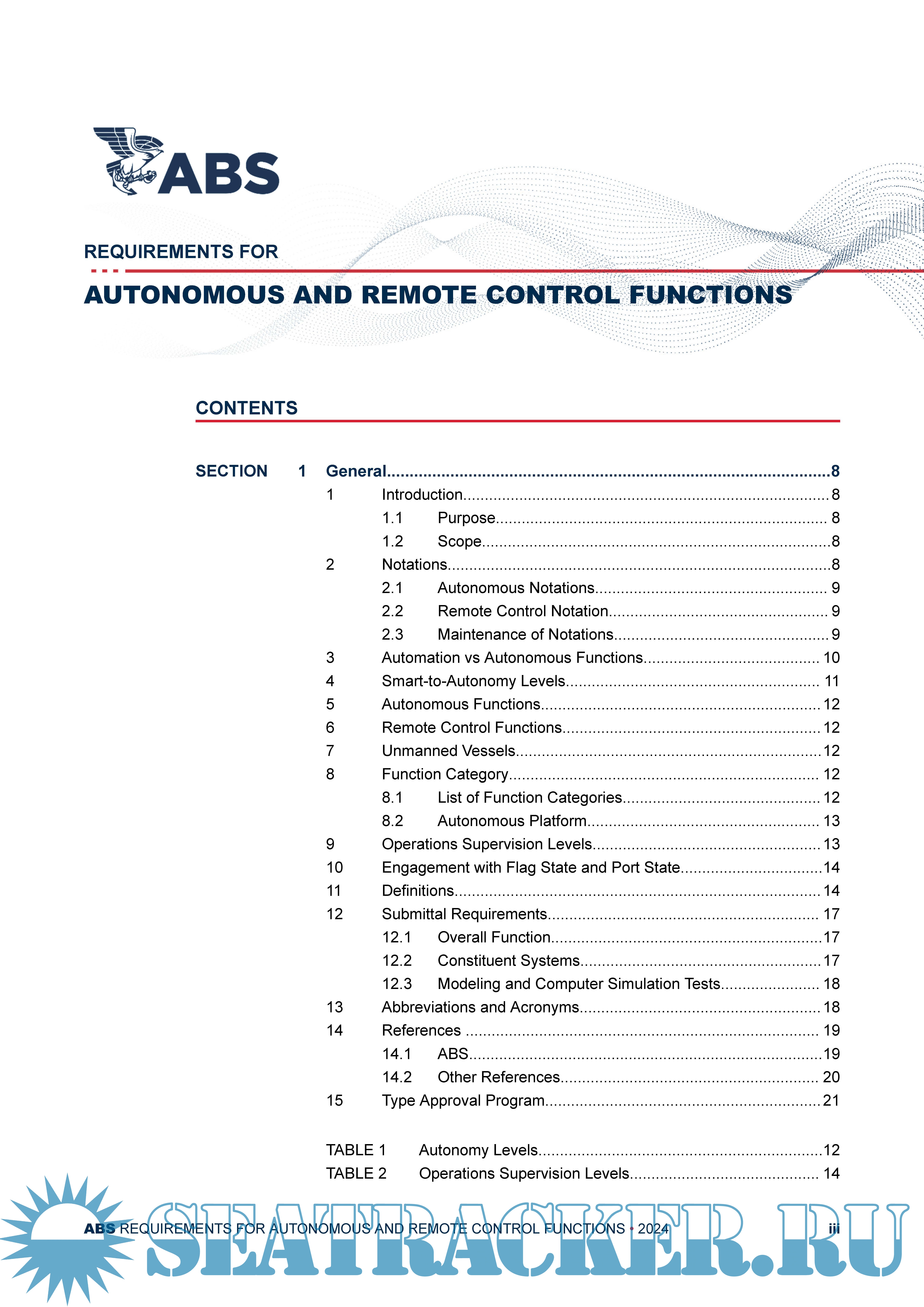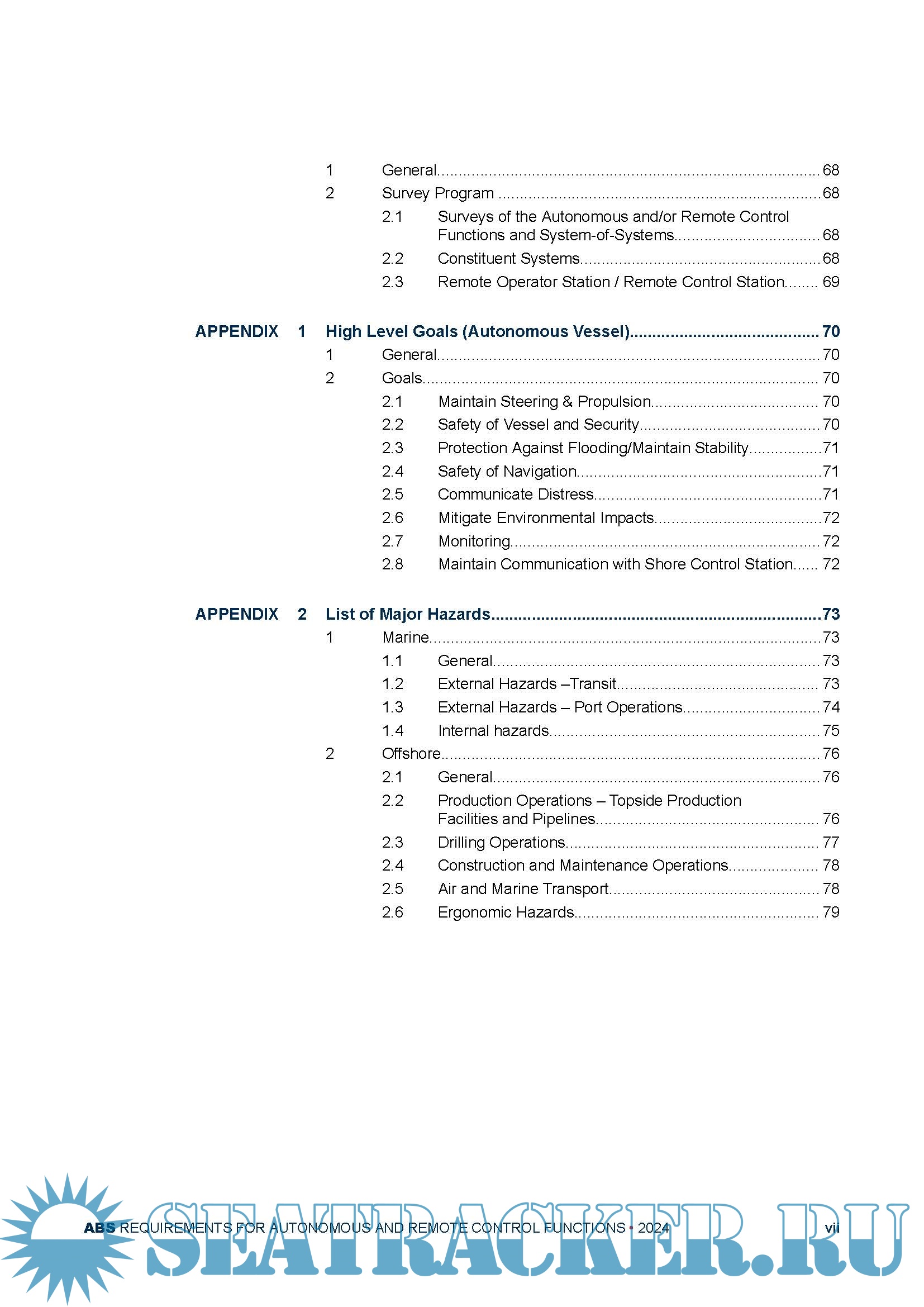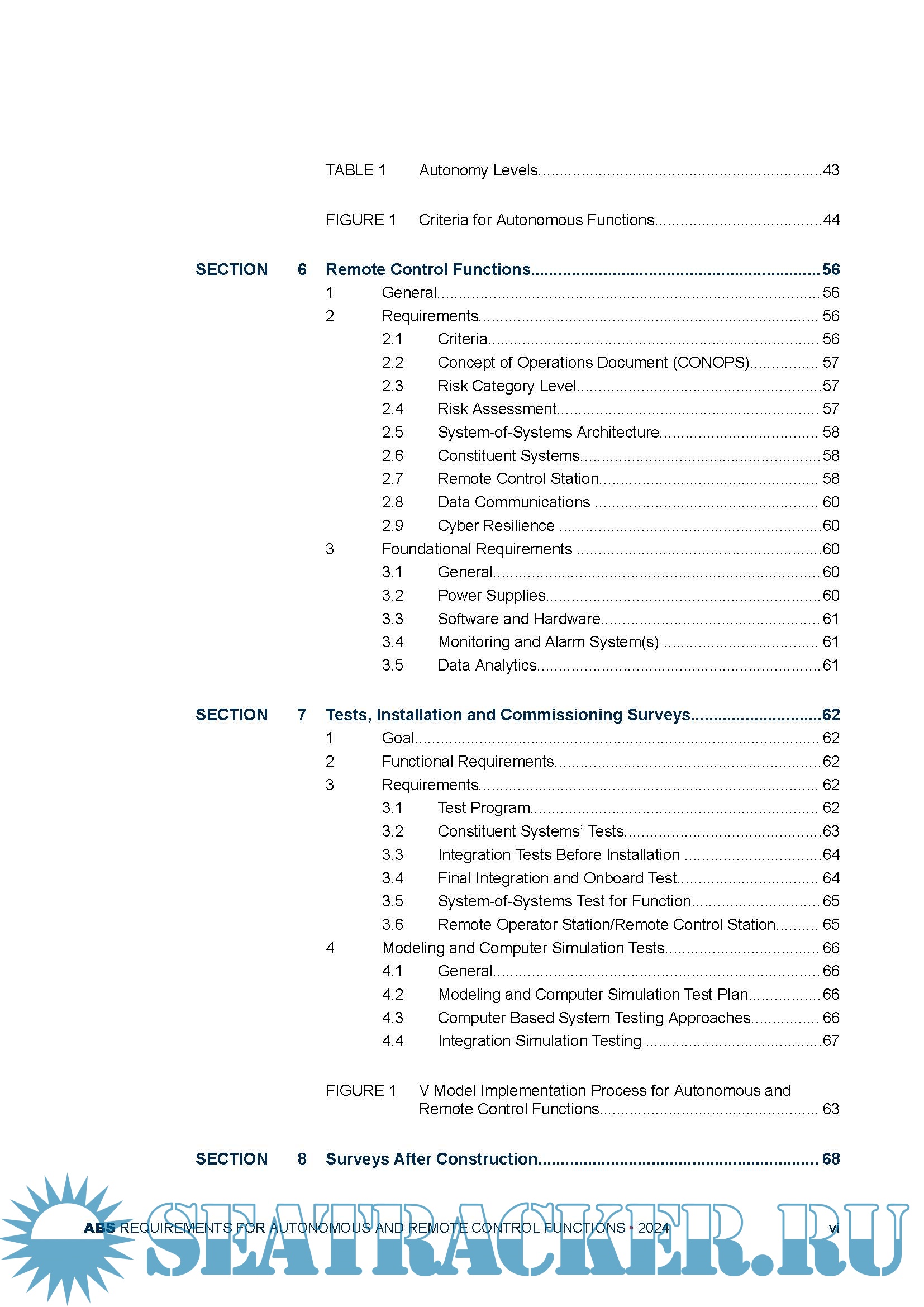 Year: 2024 Language: English Author: ABS Genre: Other Edition: October 2024 Format: PDF Quality: eBook Pages count: 80 Description: The purpose of this document is to: i) Establish a goal-based framework for the implementation of autonomous and remote control functions on board marine vessels and offshore units. This framework also considers the interactions between the operations of autonomous and remote control functions with relevant stakeholders such as Port authorities, other vessels, etc.; ii) Establish a risk-based approach coupled with a prescriptive set of requirements for the assessment of autonomous and remote control functions; iii) Provide requirements on the risk-based approval process for the implementation of autonomous and remote control functions. The October 2024 edition of this document introduces a new function category (Autonomous Platform), incorporated the IACS Unified Requirements E26 and E27 for cyber resilience requirements and E22 for the software and hardware requirements. Also, reference updates are made throughout this document.
