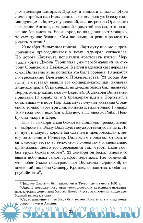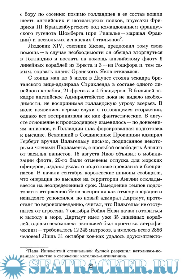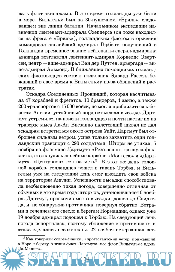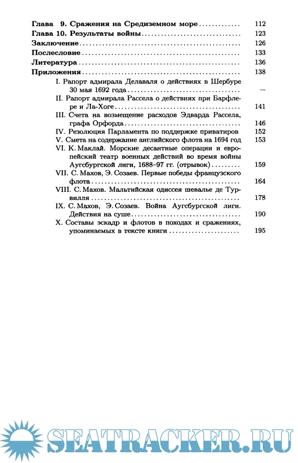 Год выпуска: 2008 Язык: Русский Автор: Созаев Э., Махов С. Жанр: Историческое Издательство: Издательство СПб университета Формат: DjVu Качество: Изначально компьютерное (eBook) Количество страниц: 237 Описание: В книге московского и самарского авторов - специалистов по истории военных действий на море во времена парусного флота - рассказывается об одной из малоизвестных для широкого читателя страниц борьбы за военное господство на море. Действия французского флота, с одной стороны, и объединенных сил флотов Англии, Голландии и Испании - с другой, описаны в ходе событий так называемой войны Аугсбургской лиги. Подробно изложены сведения о важнейших морских сражениях эпохи парусного флота, о роли политики ведущих европейских держав в развитии тактики и стратегии военно-морского флота, о крупнейших флотоводцах Франции, Голландии и Англии конца XVII века. Книга снабжена схемами крупных сражений и списками полных составов флотов и эскадр воюющих сторон в каждом из описанных сражений. В Приложении приводятся документы (рапорты и страницы из парламентских отчетов) и очерки эпизодов корсарских действий в морях Европы и Атлантическом океане.