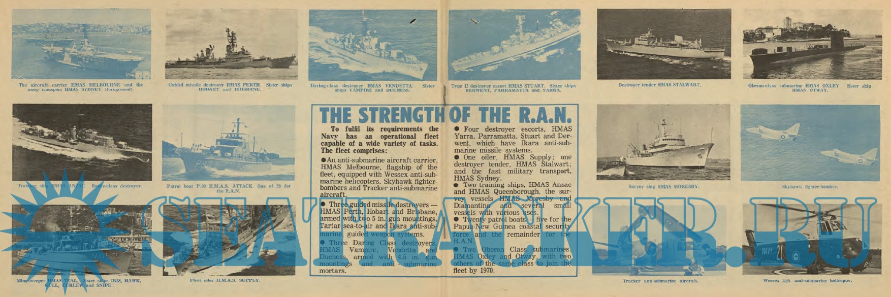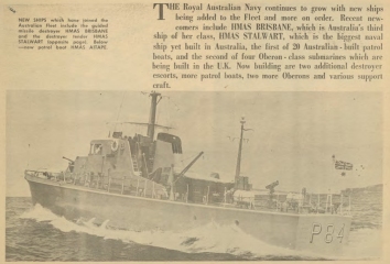 Year: 1968 Language: English Author: Kenmure Genre: Periodical publication Format: PDF Quality: Scanned pages Pages count: 15 Description: The first editions of Navy Today were published in the early 1960s to provide a snapshot of the contemporary RAN Fleet and a brief commentary on operations in which the RAN was involved. The booklets were distributed by Navy Public Relations and through Navy Recruiting centres around Australia and were produced in various formats until the mid 1990s at which time web-based technology took over.