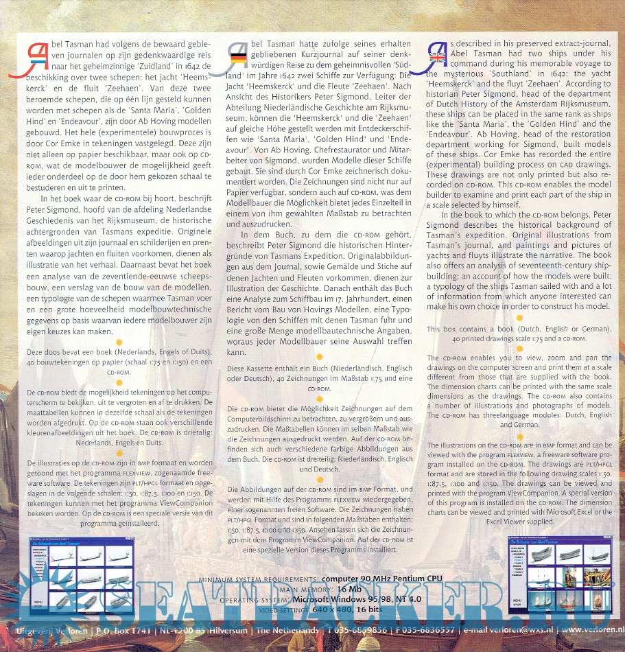 As described in his preserved extract-journal, Abel Tasman had two ships under his command during his memorable voyage to the mysterious 'Southland' in 1642: the yacht 'Heemskerck' and the fluyt 'Zeehaen'. According to historian Peter Sigmond, head of the department of Dutch History of the Amsterdam Rijksmuseum, these ships can be placed in the same rank as ships like the 'Santa Maria', the 'Golden Hind' and the 'Endeavour'. Ab Hoving, head of the restoration department working for Sigmond, built models of these ships. Cor Emke has recorded the entire (experimental) building process on cad drawings. Peter Sigmond describes the historical background of Tasman's expedition. Original illustrations from Tasman's journal, and paintings and pictures of yachts and fluyts illustrate the narrative. The book also offers an analysis of seventeenth-century shipbuilding; an account of how the models were built; a typology of the ships Tasman sailed with and a lot of information from which anyone interested can make his own choice in order to construct his model.