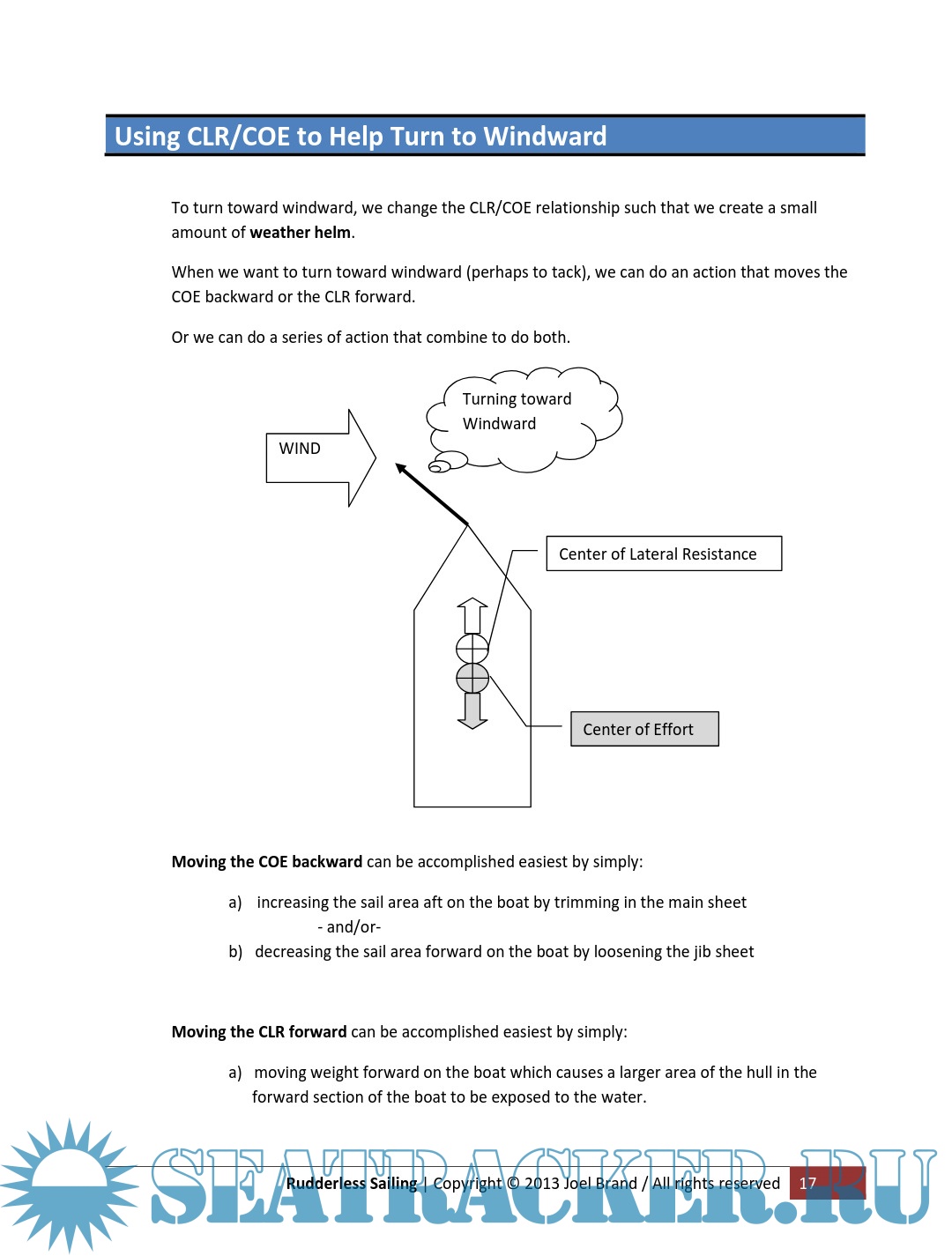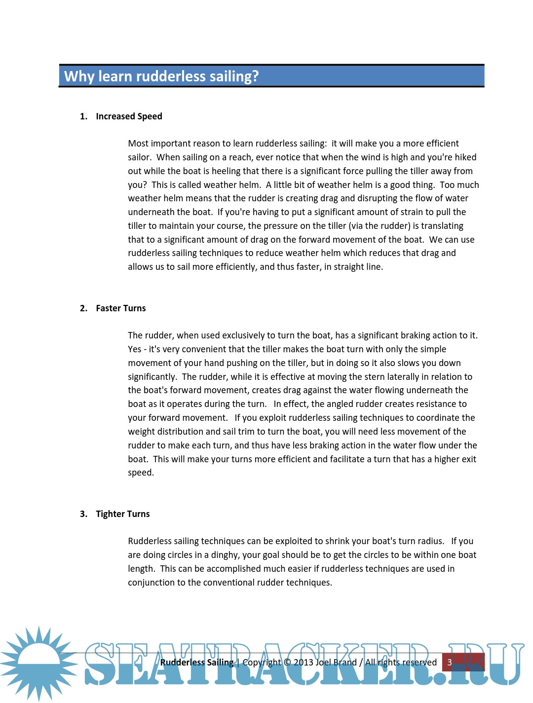 Description: A proficient and efficient sailor masters the technique of sailing their boat when the control mechanisms are limited. Rudderless sailing is using weight distribution and sail trim, as opposed to the rudder, to control the boat. Understanding rudderless sailing allows you to sail faster, make quicker turns, handle rudder failure emergencies, and is - simply put - very impressive to watch. This eBook thoroughly covers the motivations, physics, sail trim techniques, weight distribution concepts, and a practical step-by-step guide to learning to sail rudderless. After reading this eBook you will be able to effectively understand, implement, and teach rudderless sailing