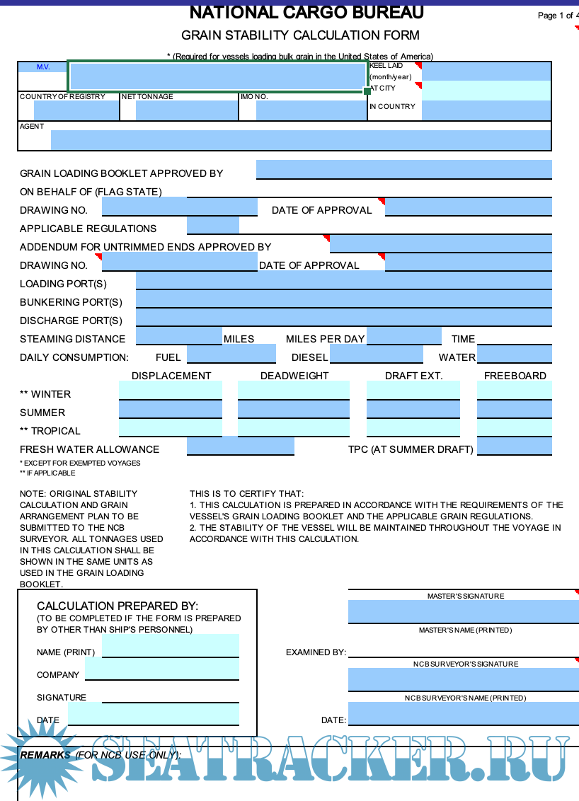 NCB Grain Stability Calculation Form - National Cargo Bureau [2021, PDF]