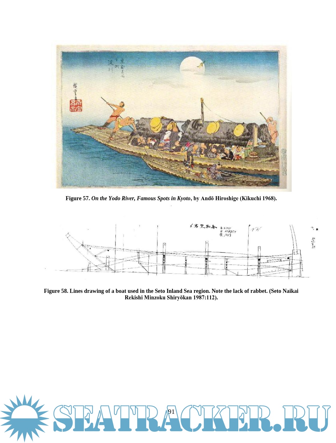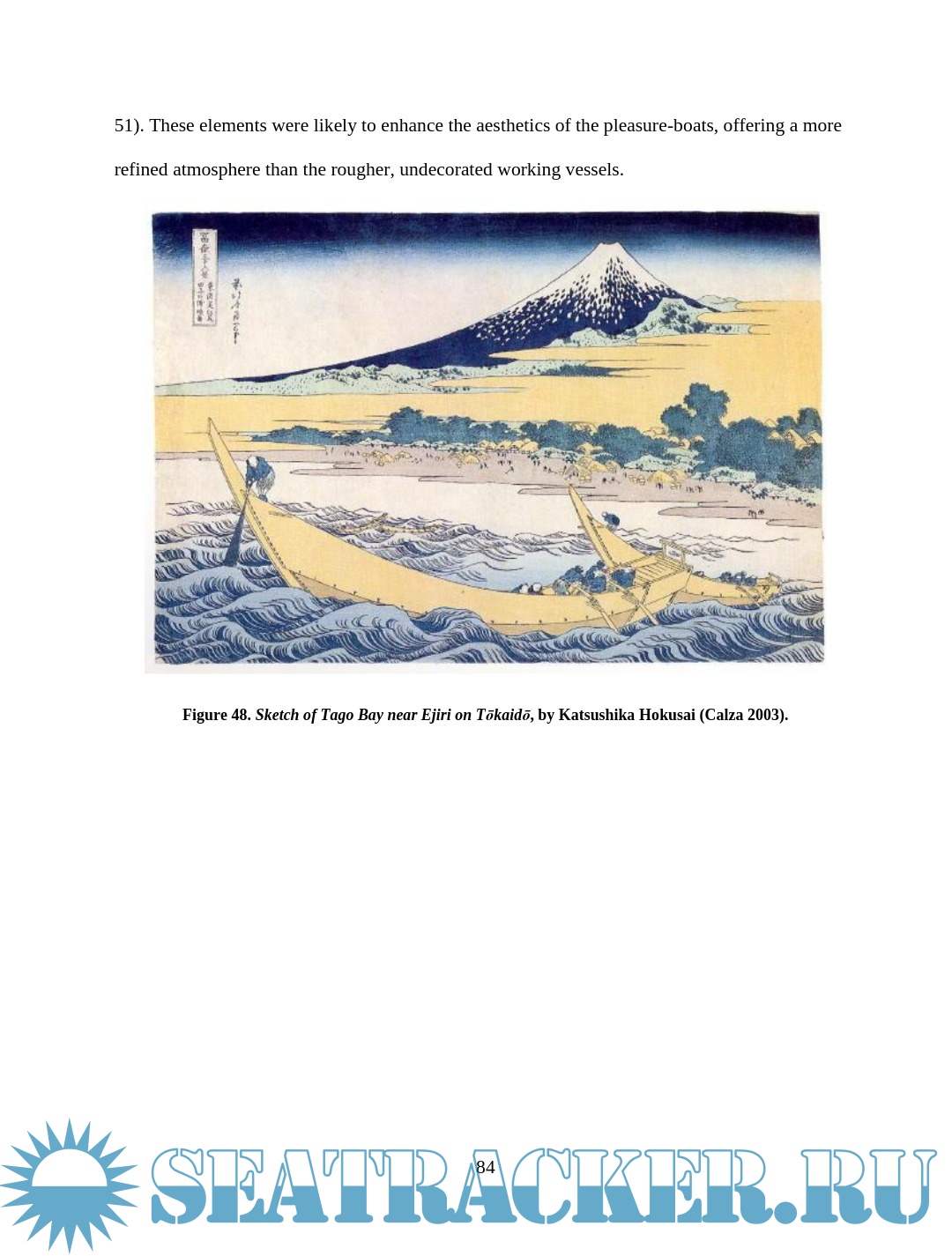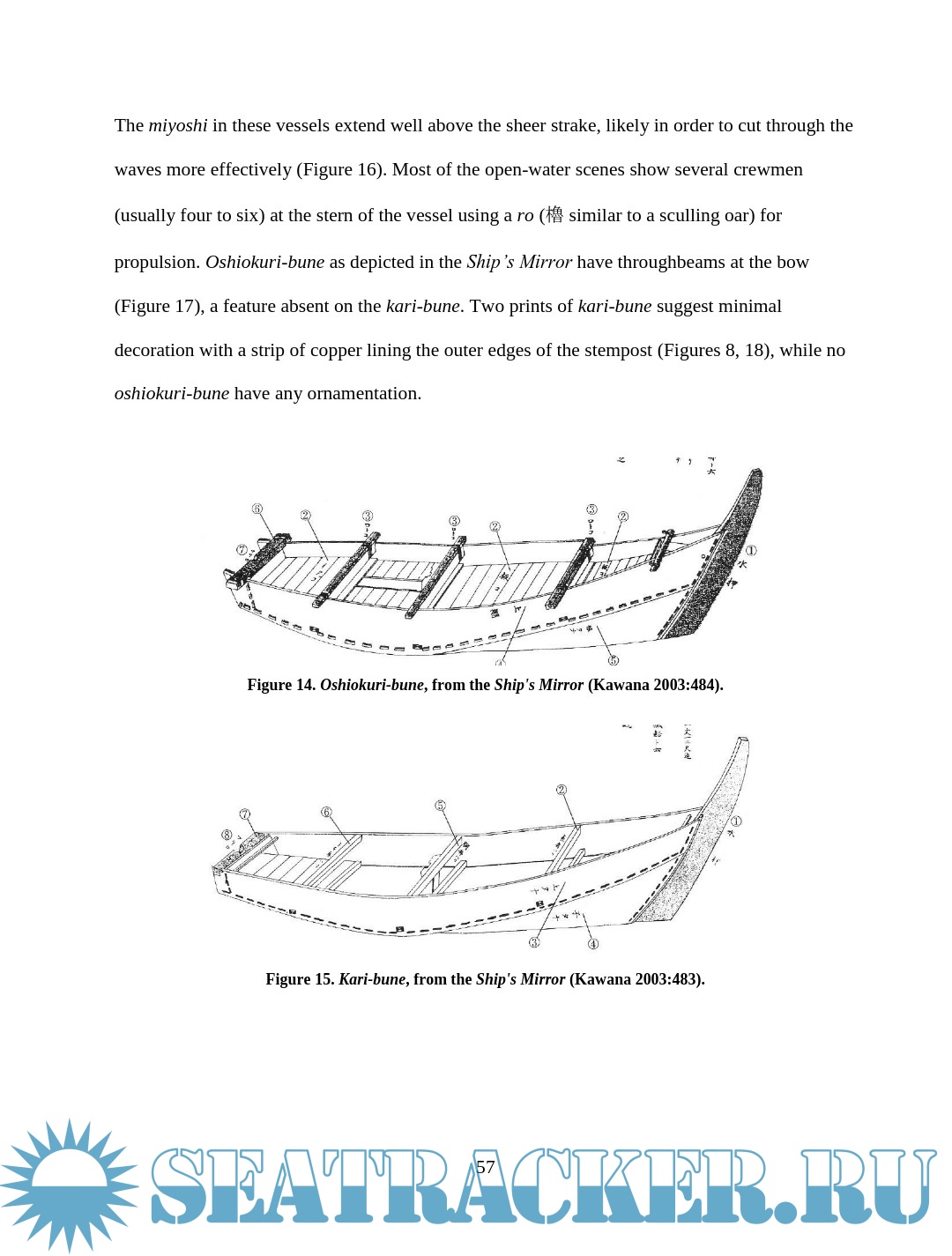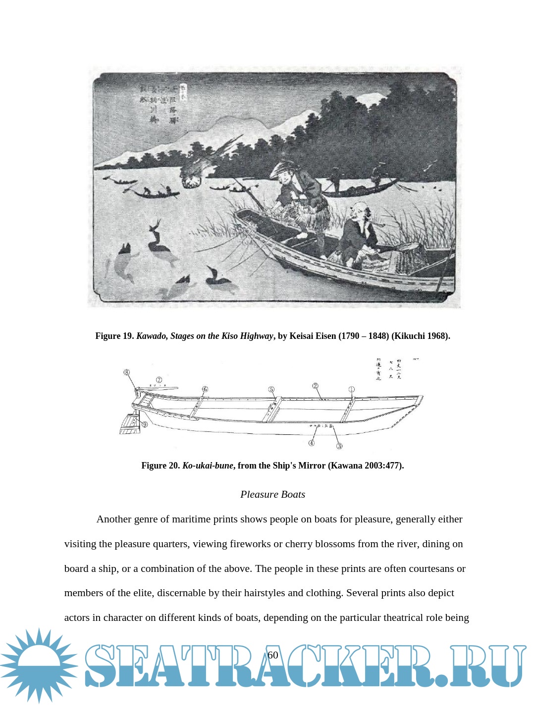 Description: This thesis examines depictions of wooden boats in Japanese woodblock prints of the late Edo period (1603 – 1867). Watercraft were an integral part of Edo Japan, yet little Western scholarship has examined their role. The images are an important resource for understanding more about maritime Japan, filling in some of the gaps left in the documentary and archaeological records. This thesis will compare details of construction and usage visible in the prints with contemporary models, documents, and modern boats built using traditional construction methods in an effort to assess the accuracy of the artistic renditions and learn about the context in which the boats were used. Though woodblock prints cannot provide the accuracy of measured construction drawings, careful study and comparison of the different types of vessels in the prints reveal much about the great range of watercraft in daily use during the Edo period.