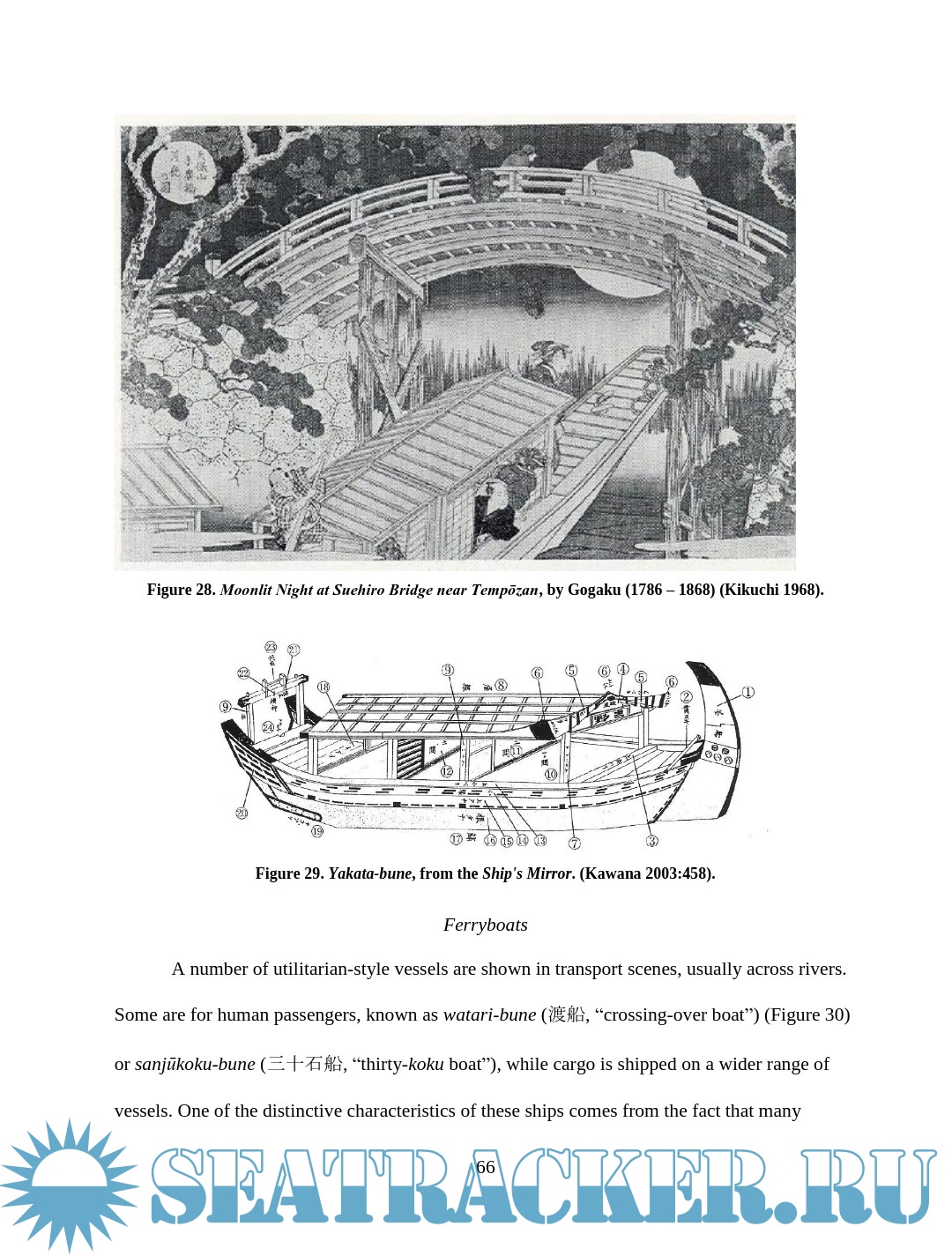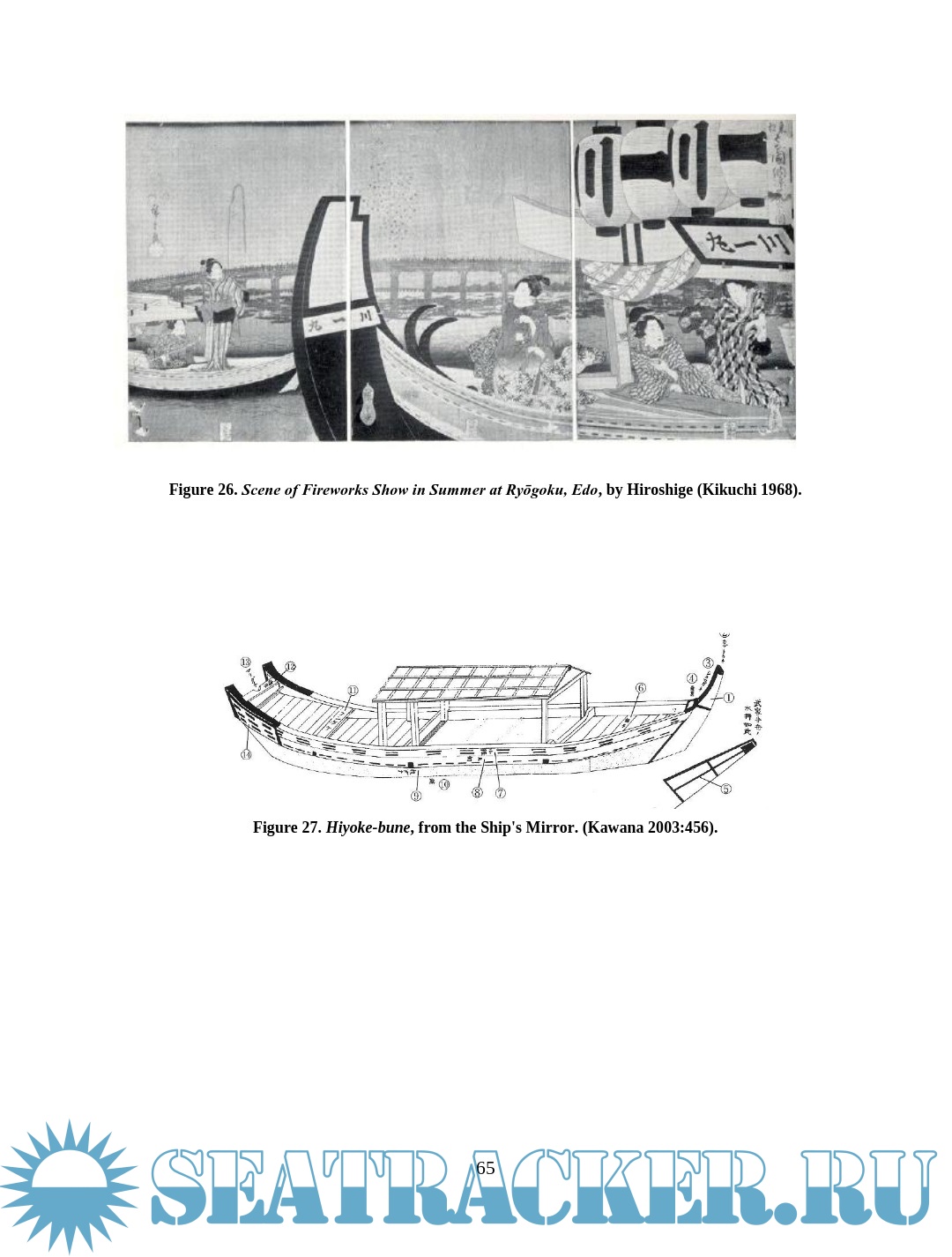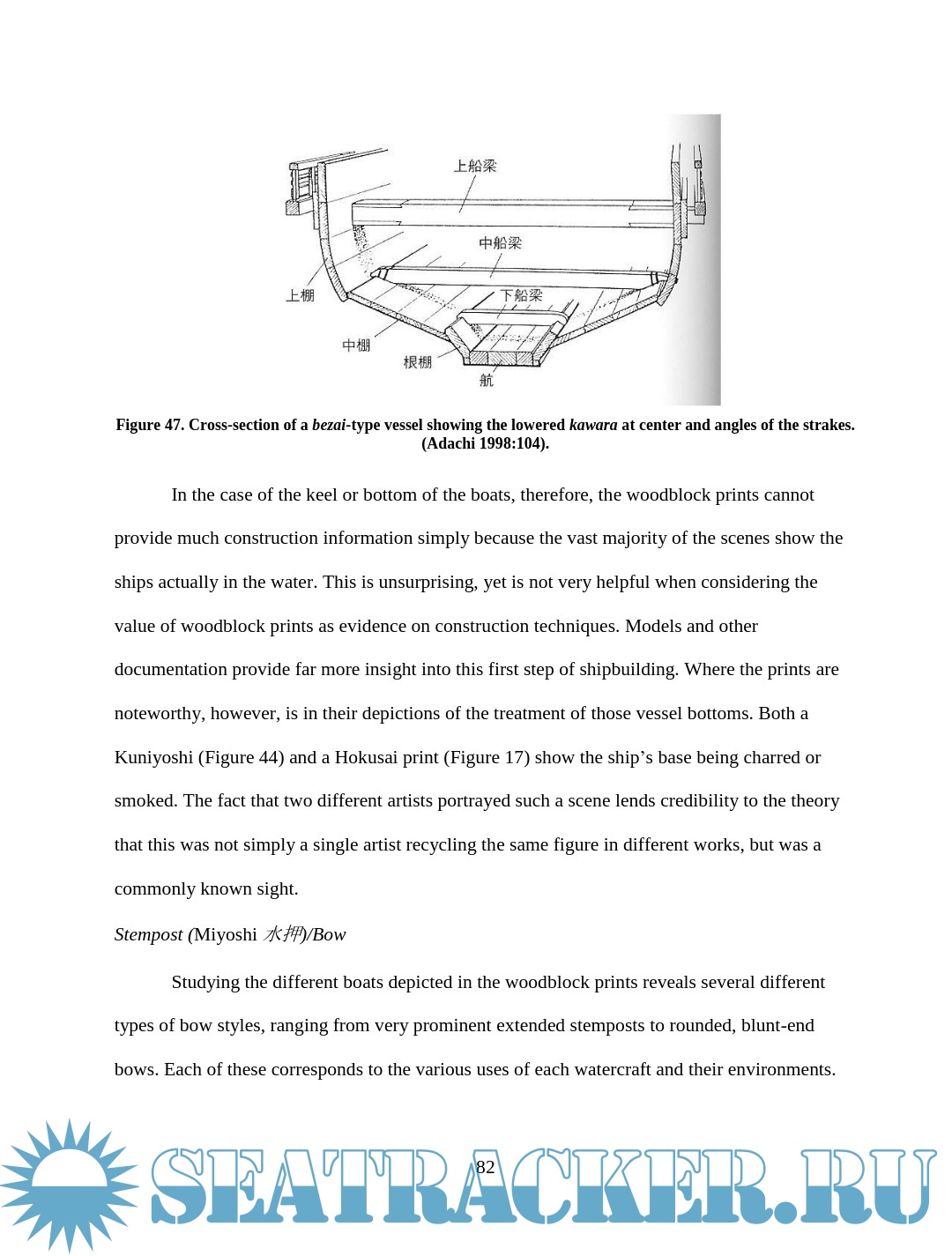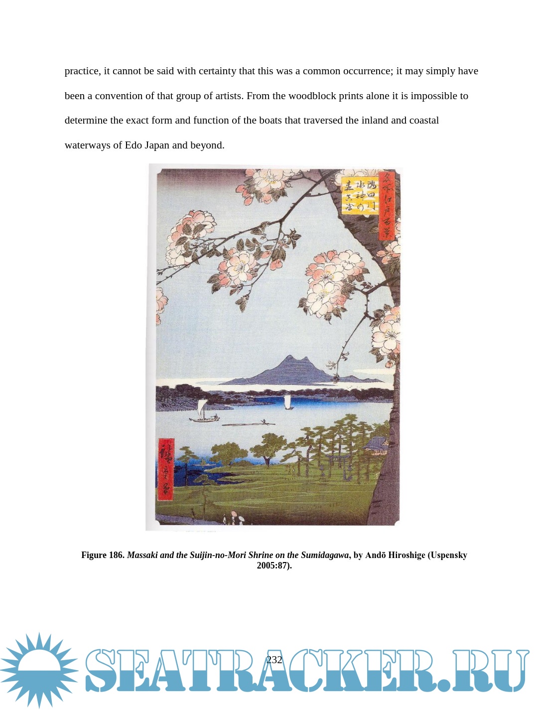 Description: This thesis examines depictions of wooden boats in Japanese woodblock prints of the late Edo period (1603 – 1867). Watercraft were an integral part of Edo Japan, yet little Western scholarship has examined their role. The images are an important resource for understanding more about maritime Japan, filling in some of the gaps left in the documentary and archaeological records. This thesis will compare details of construction and usage visible in the prints with contemporary models, documents, and modern boats built using traditional construction methods in an effort to assess the accuracy of the artistic renditions and learn about the context in which the boats were used. Though woodblock prints cannot provide the accuracy of measured construction drawings, careful study and comparison of the different types of vessels in the prints reveal much about the great range of watercraft in daily use during the Edo period.