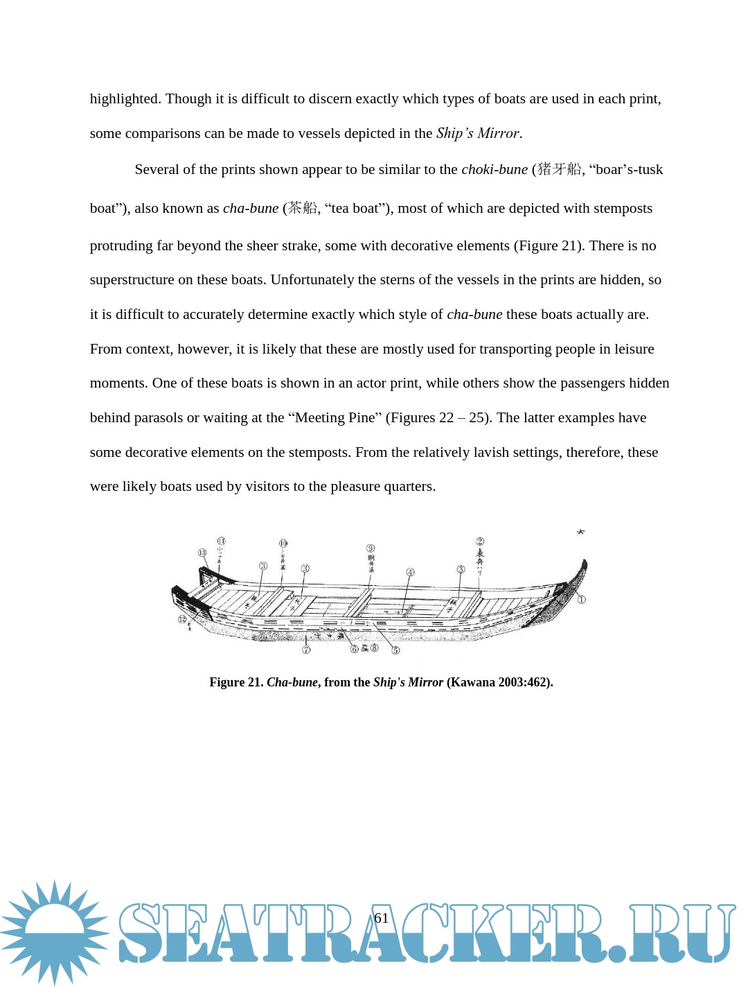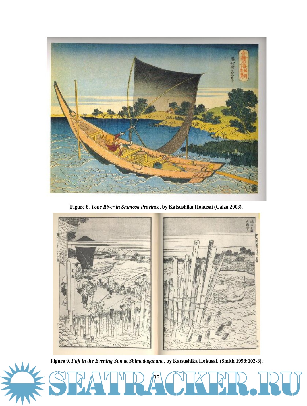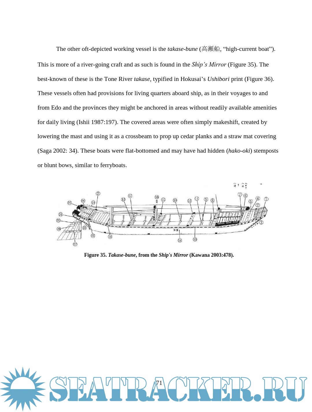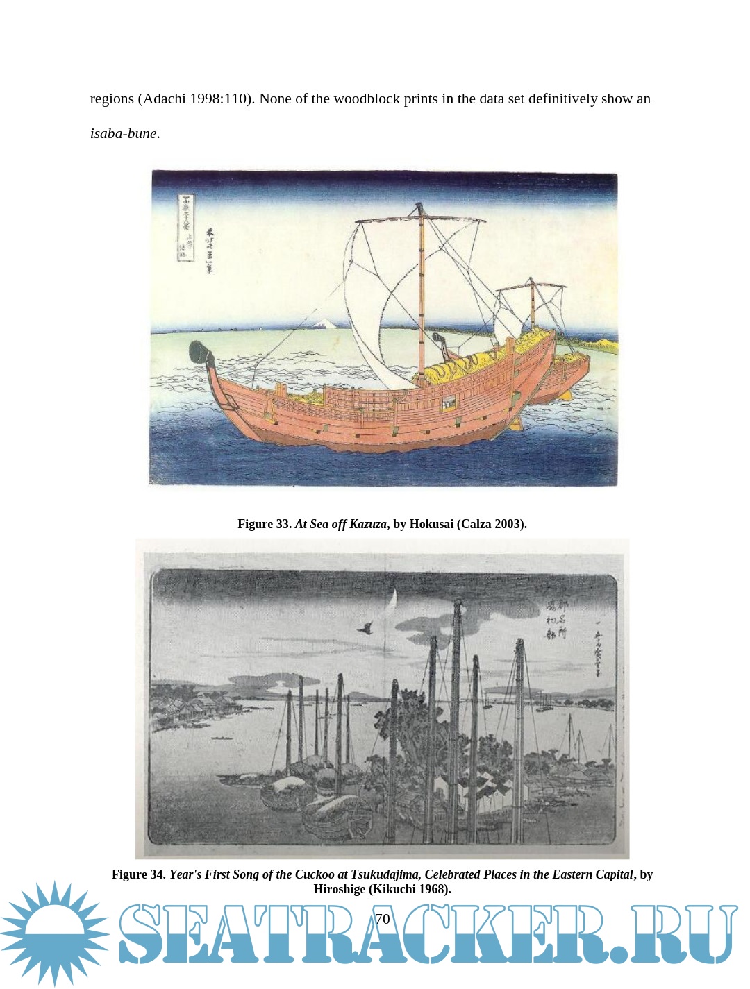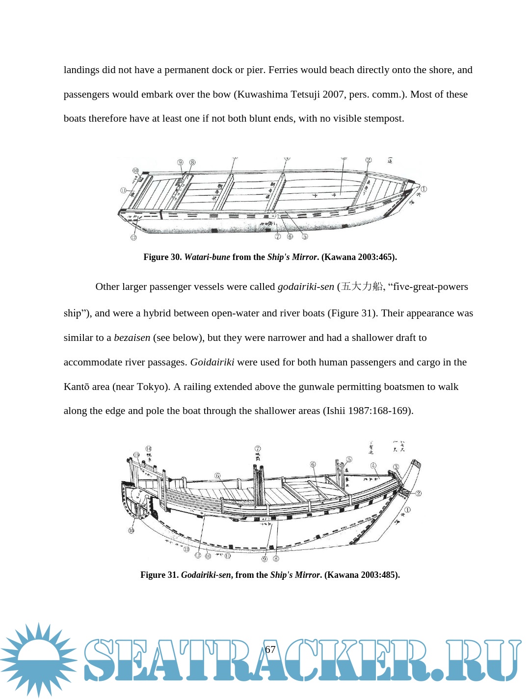 Description: This thesis examines depictions of wooden boats in Japanese woodblock prints of the late Edo period (1603 – 1867). Watercraft were an integral part of Edo Japan, yet little Western scholarship has examined their role. The images are an important resource for understanding more about maritime Japan, filling in some of the gaps left in the documentary and archaeological records. This thesis will compare details of construction and usage visible in the prints with contemporary models, documents, and modern boats built using traditional construction methods in an effort to assess the accuracy of the artistic renditions and learn about the context in which the boats were used. Though woodblock prints cannot provide the accuracy of measured construction drawings, careful study and comparison of the different types of vessels in the prints reveal much about the great range of watercraft in daily use during the Edo period.