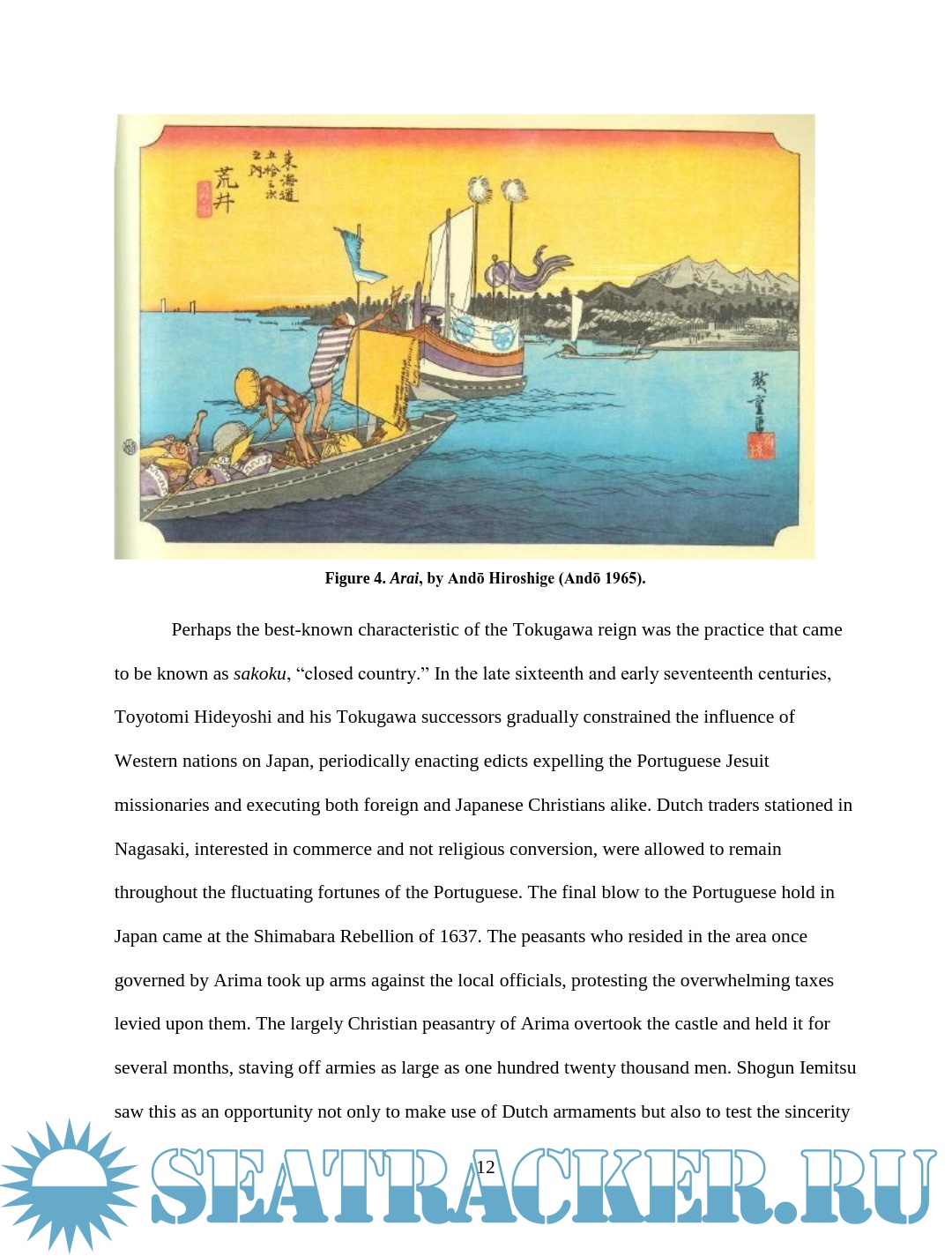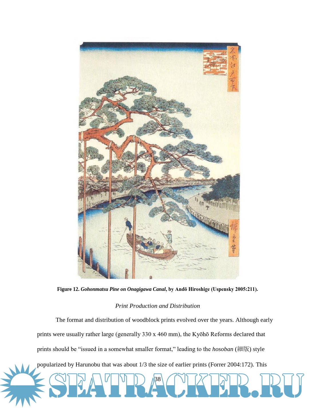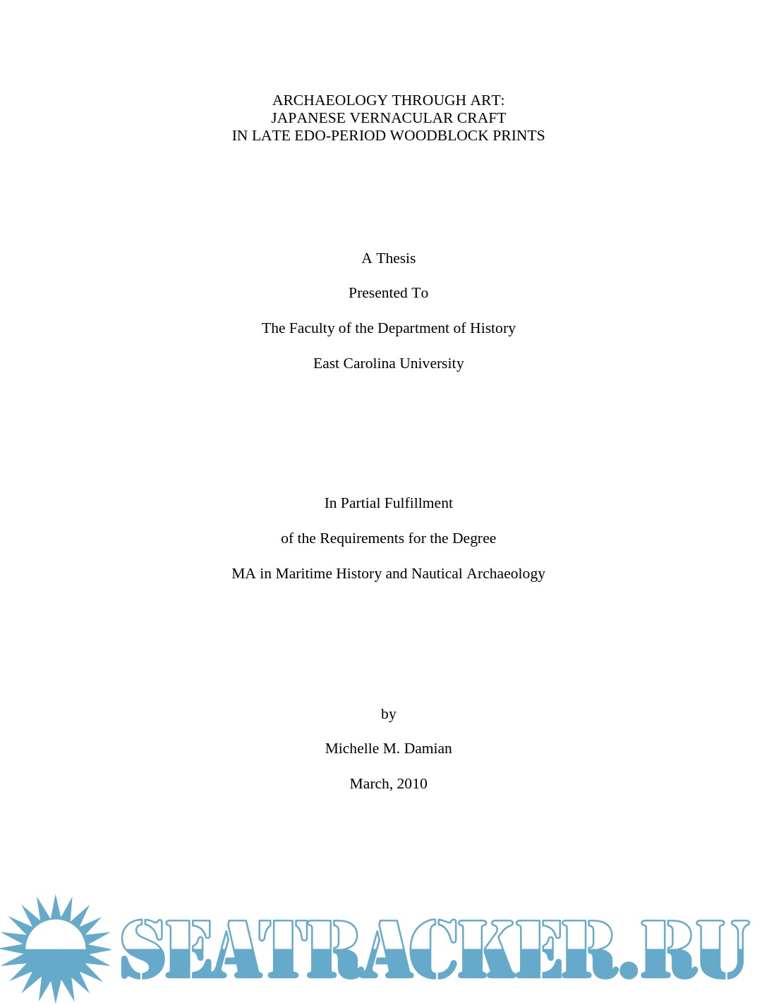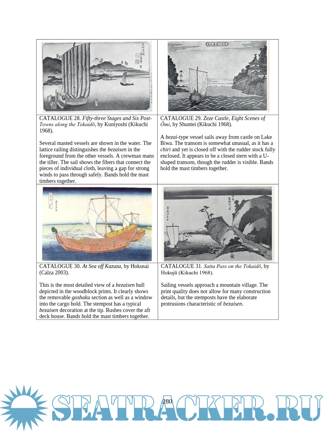 Description: This thesis examines depictions of wooden boats in Japanese woodblock prints of the late Edo period (1603 – 1867). Watercraft were an integral part of Edo Japan, yet little Western scholarship has examined their role. The images are an important resource for understanding more about maritime Japan, filling in some of the gaps left in the documentary and archaeological records. This thesis will compare details of construction and usage visible in the prints with contemporary models, documents, and modern boats built using traditional construction methods in an effort to assess the accuracy of the artistic renditions and learn about the context in which the boats were used. Though woodblock prints cannot provide the accuracy of measured construction drawings, careful study and comparison of the different types of vessels in the prints reveal much about the great range of watercraft in daily use during the Edo period.