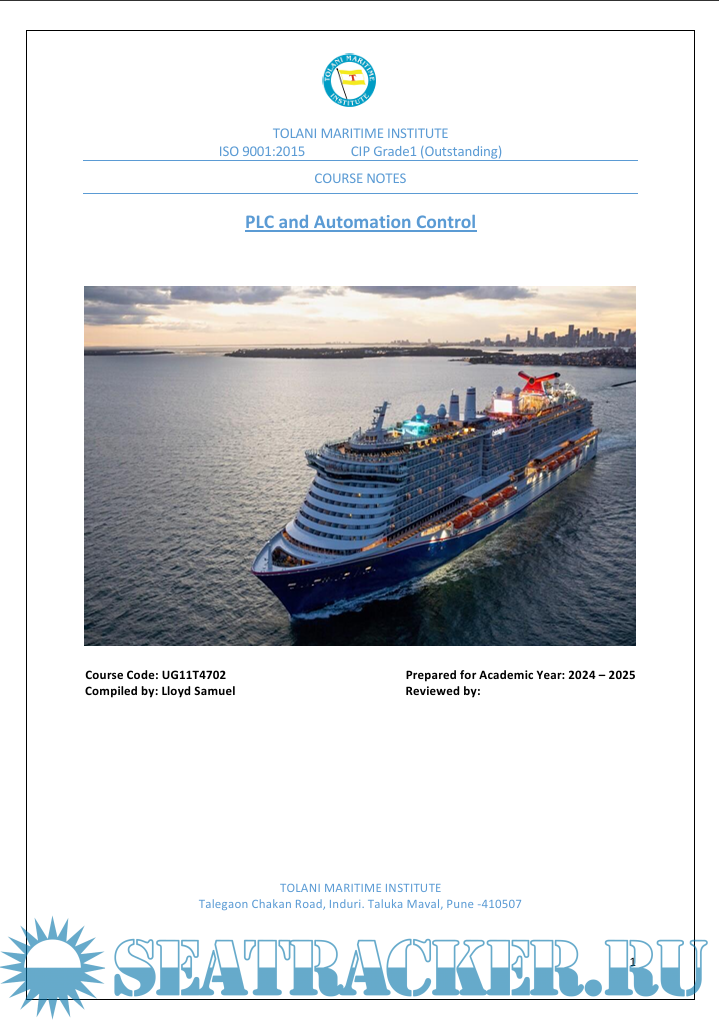 Year: 2024 Language: English Author: Lloyd Samuel Genre: Training courses Publisher: Tolani Maritime Institute Edition: 1st ISBN: NA Format: PDF Quality: eBook Pages count: 58 Description: Tolani Maritime Institute's eBook on PLC and Automation Control