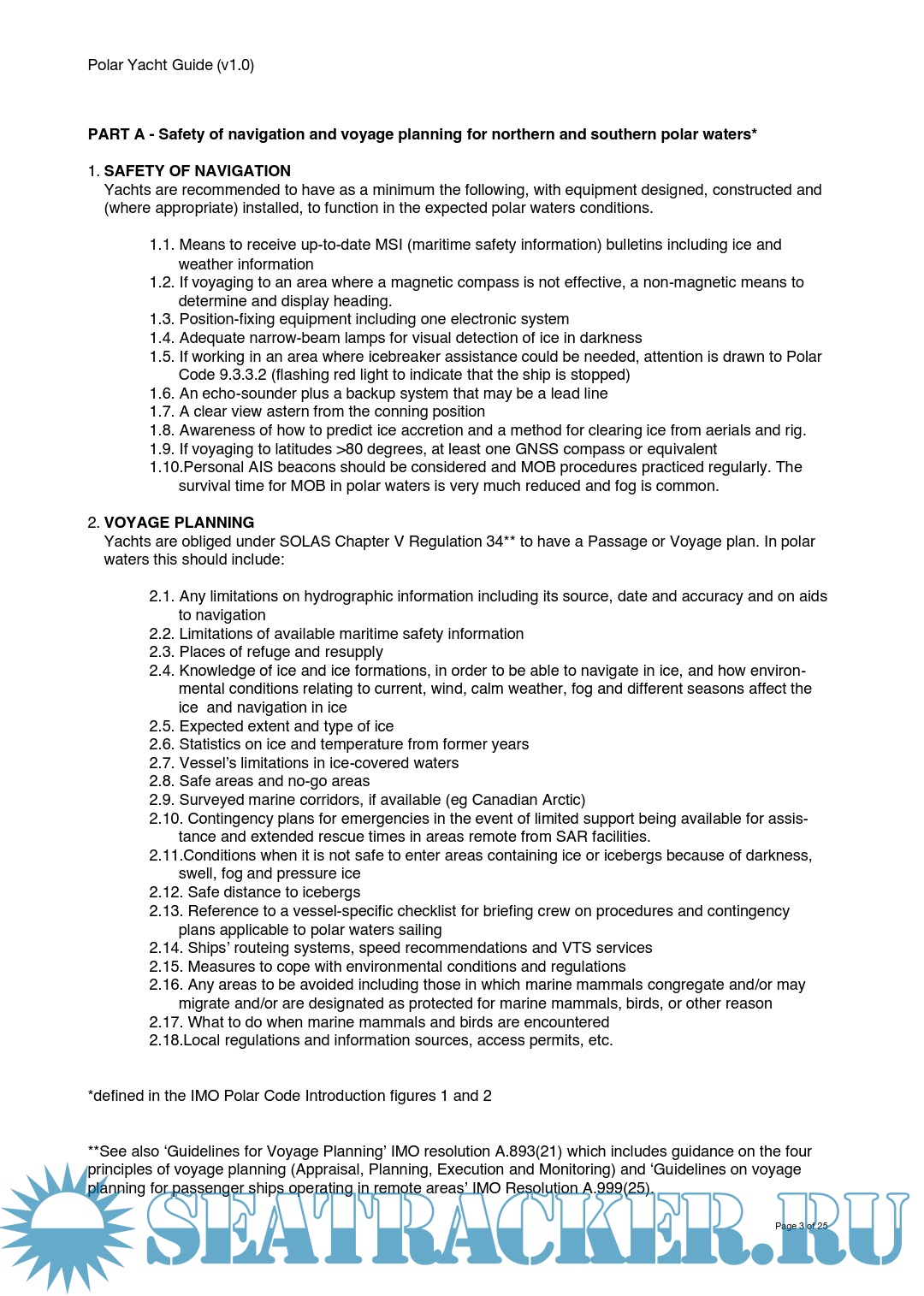 Description: GOAL To encourage safe and environmentally-friendly navigation by Pleasure Yachts not engaged in trade, of less than or equal to 300 GT in Arctic and Antarctic Polar Waters*. Attention is drawn to the Polar Code published by IMO for SOLAS ships. The Polar Yacht Guide sets out to offer, in parallel with the Polar Code, advice and guidance of a more detailed nature than is possible in the Polar Code, and at the same time particularly or uniquely relevant to Pleasure Yachts.
