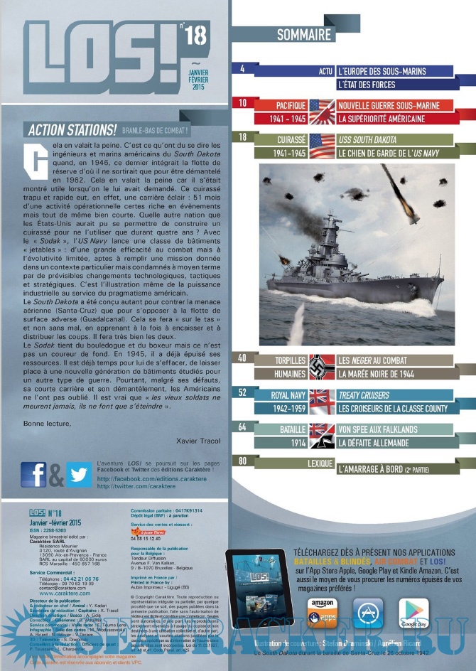 Description: LES ÉDITIONS CARAKTÈRE PRENNENT LE LARGE EN LANÇANT UN NOUVEAU MAGAZINE CONSACRÉ À LA GUERRE NAVALE !Les sujets passionnants ne manquent pas et LOS ! met un point d’honneur à les présenter au lecteur comme cela n’a jamais été fait dans la presse française jusqu’à présent. Un seul mot d’ordre pour l’équipe rédactionnelle : rigueur scientifique et présentation ludique !S’appuyant sur un fond photographique d’exception, sur des plans de bateaux et d’avions, les éditions Caraktère innovent une fois de plus en vous proposant aussi des vues 3D détaillées, le tout au service de textes soigneusement rédigés par des auteurs spécialisés. Vous comprendrez ainsi comment fonctionne un submersible, comment se déroule un combat naval, comment est conçu un cuirassé ou comment attaquent les avions-torpilleurs !Revivez au fil des pages l’aventure humaine exceptionnelle des matelots de la marine marchande affrontant les U-Boote en Arctique, ou celle des pilotes embarqués sur les porte-avions américains et japonais. Lisez les exploits des hommes-grenouilles italiens en Méditerranée, des équipages des vedettes lance-torpilles dans la Manche, des sous-marins soviétiques de la guerre froide ou des grands cuirassés de 1914-18