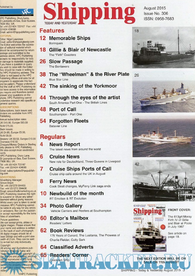 Year: 2015 Language: English Author: Nigel Lawrence (Editor) Genre: Periodical publication Edition: 2015-08 Format: PDF Quality: eBook Pages count: 66 Description: Shipping T&Y is a monthly magazine for the shipping enthusiast offering up-to-date information, topical and in-depth historical articles alongside images, many of which are exclusive to the magazine.Shipping Today & Yesterday is a specialist magazine for the shipping enthusiast offering up-to-date information, topical and in-depth historical articles.Shipping Today & Yesterday was first produced in March 1990 by, the then Editor and Publisher, John Young. The first edition stated that it would, “offer a news service covering important developments in the Shipping industry Today and will look back at ships and events of Yesterday, with regular features on merchant ships