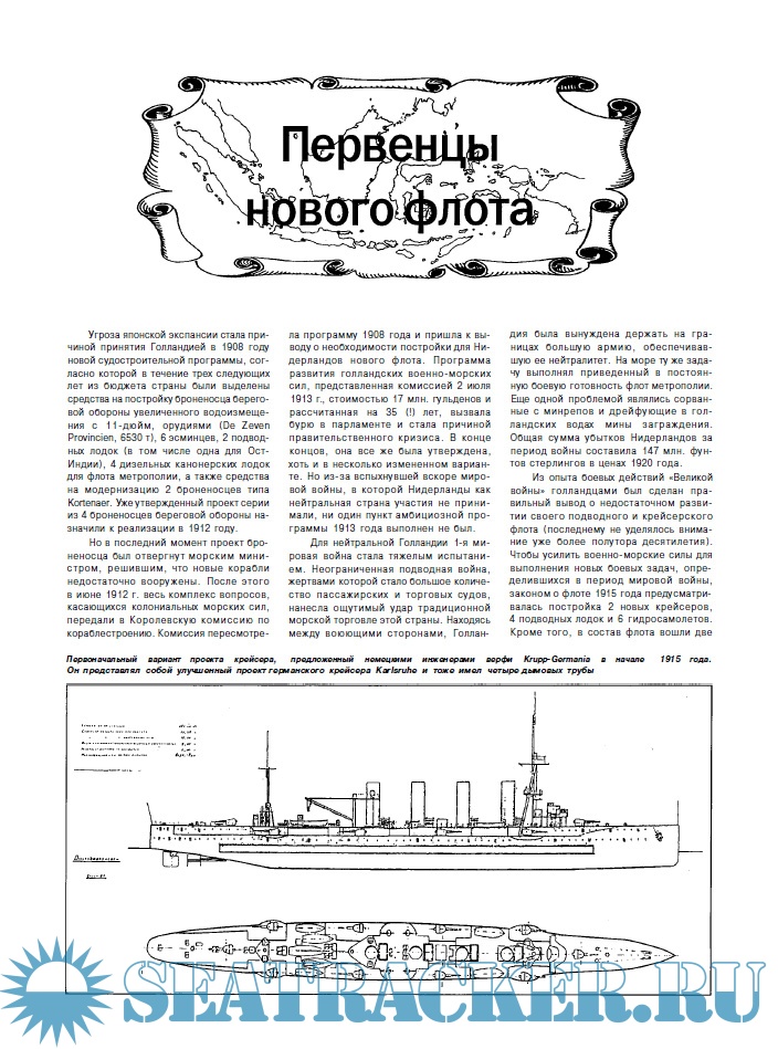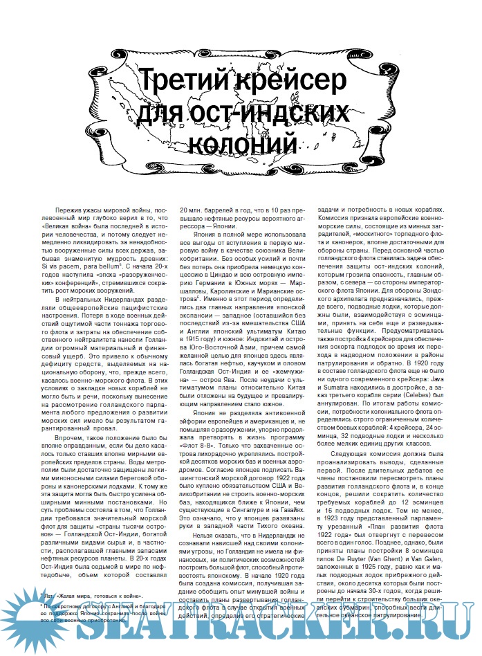 Описание: Возможно, название «колониальный крейсер» у многих ассоциируется с чем-то экзотическим вроде вооруженной гарпунами прогулочной яхты или, максимум, со сторожевиком с мелкокалиберной артиллерией. На деле же, колониальные крейсера Нидерландов мало в чем уступали аналогам своего класса из состава флотов ведущих морских держав. Однако в процессе работы не раз приходилось слышать, что у голландцев, мол, «небоевые корабли», которые ничем себя не проявили. Хочется возразить этим непререкаемым «авторитетам», с томным придыханием вспоминающим о потопленном в первом же боевом походе линкоре Bismarck и пугалом проторчавшем всю войну в норвежских шхерах Tirpitz, что так можно договориться до признания «небоевым» всего советского надводного флота, не имевшего ни одного боевого соприкосновения на уровне выше эсминцев противника и исполнявшего почти исключительно задачи огневой поддержки войск и транспортно-снабженческие функции.
