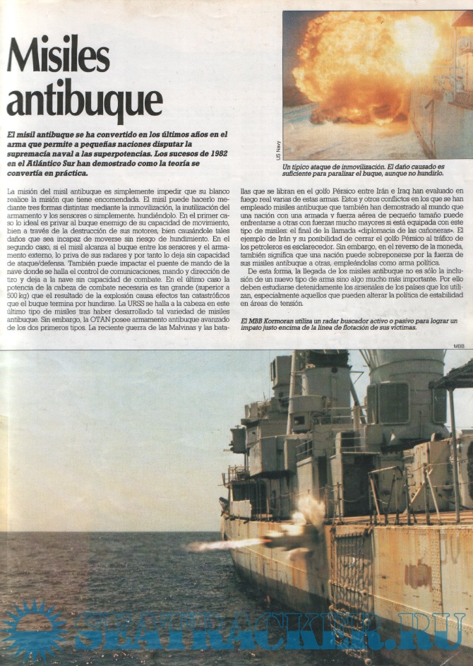 Enciclopedia de las Armas del Siglo XX.El misil antibuque se ha convertido en los ultimos años en el arma que permite a pequeñas naciones disputar la supremacia naval a las superpotencias. Los sucesos de 1982 en el Atlantico Sur han demostrado como la teoria se convertia en practica.