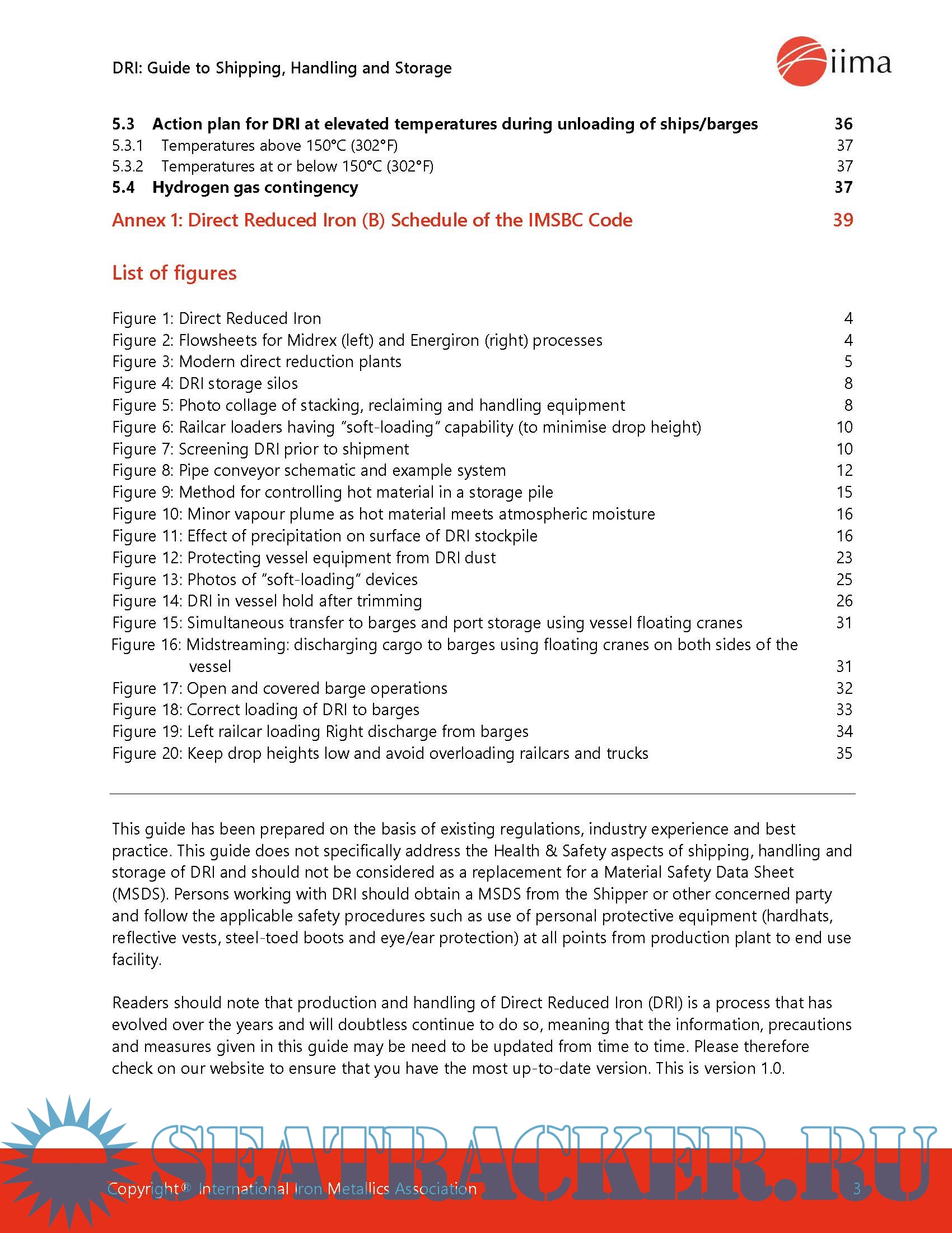 This guide has been prepared on the basis of existing regulations, industry experience and best practice. This guide does not specifically address the Health & Safety aspects of shipping, handling and storage of DRI and should not be considered as a replacement for a Material Safety Data Sheet (MSDS). Persons working with DRI should obtain a MSDS from the Shipper or other concerned party and follow the applicable safety procedures.