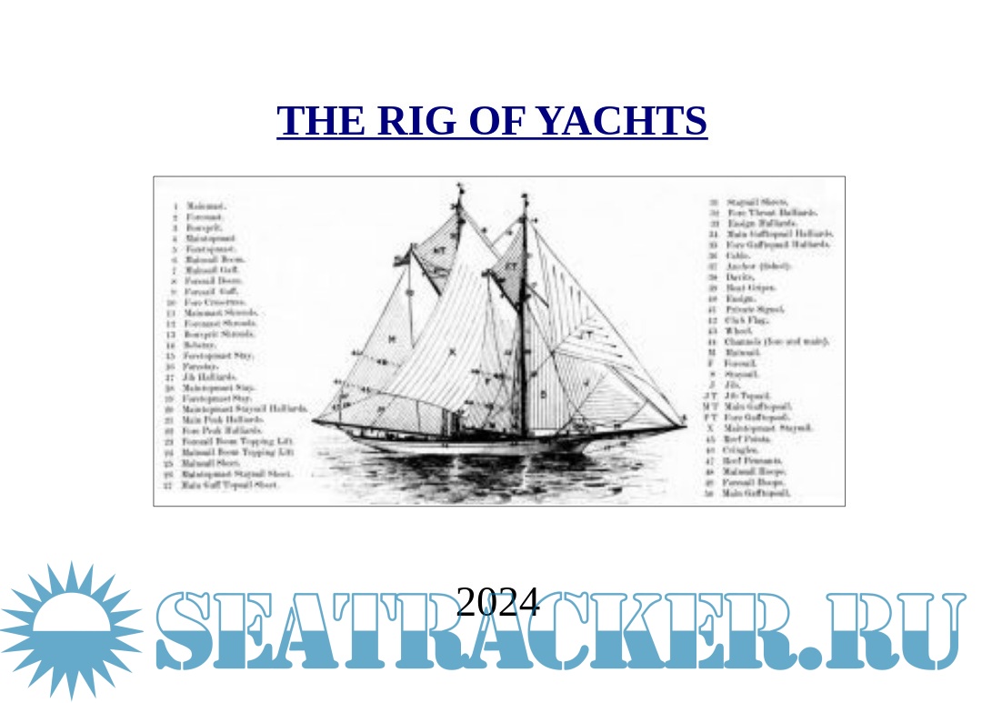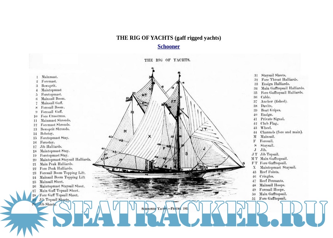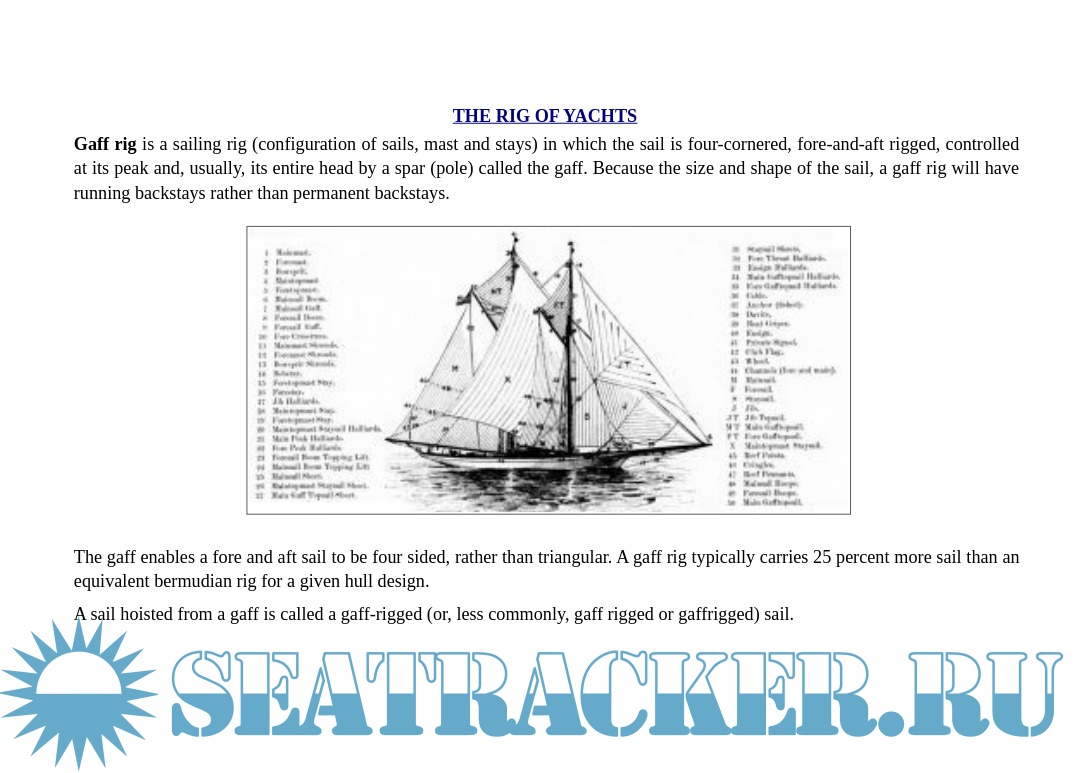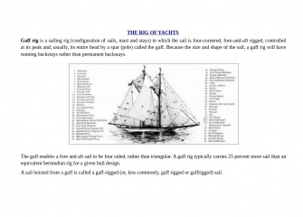 Description: Gaff rig is a sailing rig (configuration of sails, mast and stays) in which the sail is four-cornered, fore-and-aft rigged, controlled at its peak and, usually, its entire head by a spar (pole) called the gaff. Because the size and shape of the sail, a gaff rig will have running backstays rather than permanent backstays.