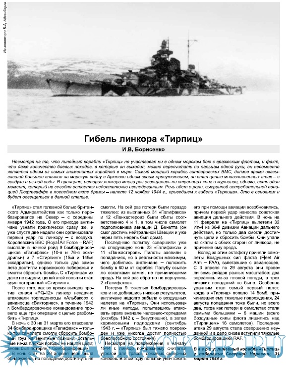 Работа Игоря Викторовича Борисенко (г. Киселевск, Кемеровской области) рассказывает о бесславном конце одного из самых знаменитых кораблей Второй мировой войны - германского линкора «Тирпиц».
