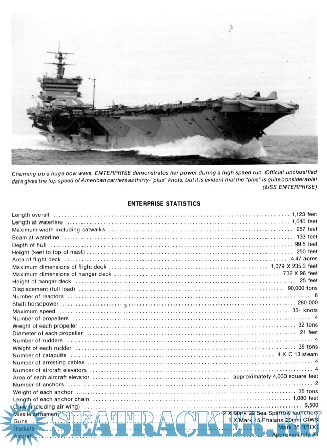 Description: USS Enterprise (CVN-65), formerly CVA(N)-65, is a decommissioned United States Navy aircraft carrier. In 1958, she became the first nuclear-powered aircraft carrier in the United States Navy, and the eighth United States naval vessel to bear the name. Like her predecessor of World War II fame, she is nicknamed "Big E". At 1,123 feet (342 m), she is the longest naval vessel ever built and the only ship of a class that was originally planned to have five other ships. Her 93,284-long-ton (94,781 t) displacement ranks her class as the third largest carrier class, after the Nimitz class and the Gerald R. Ford class. Enterprise had a crew of some 4,600 service members.
