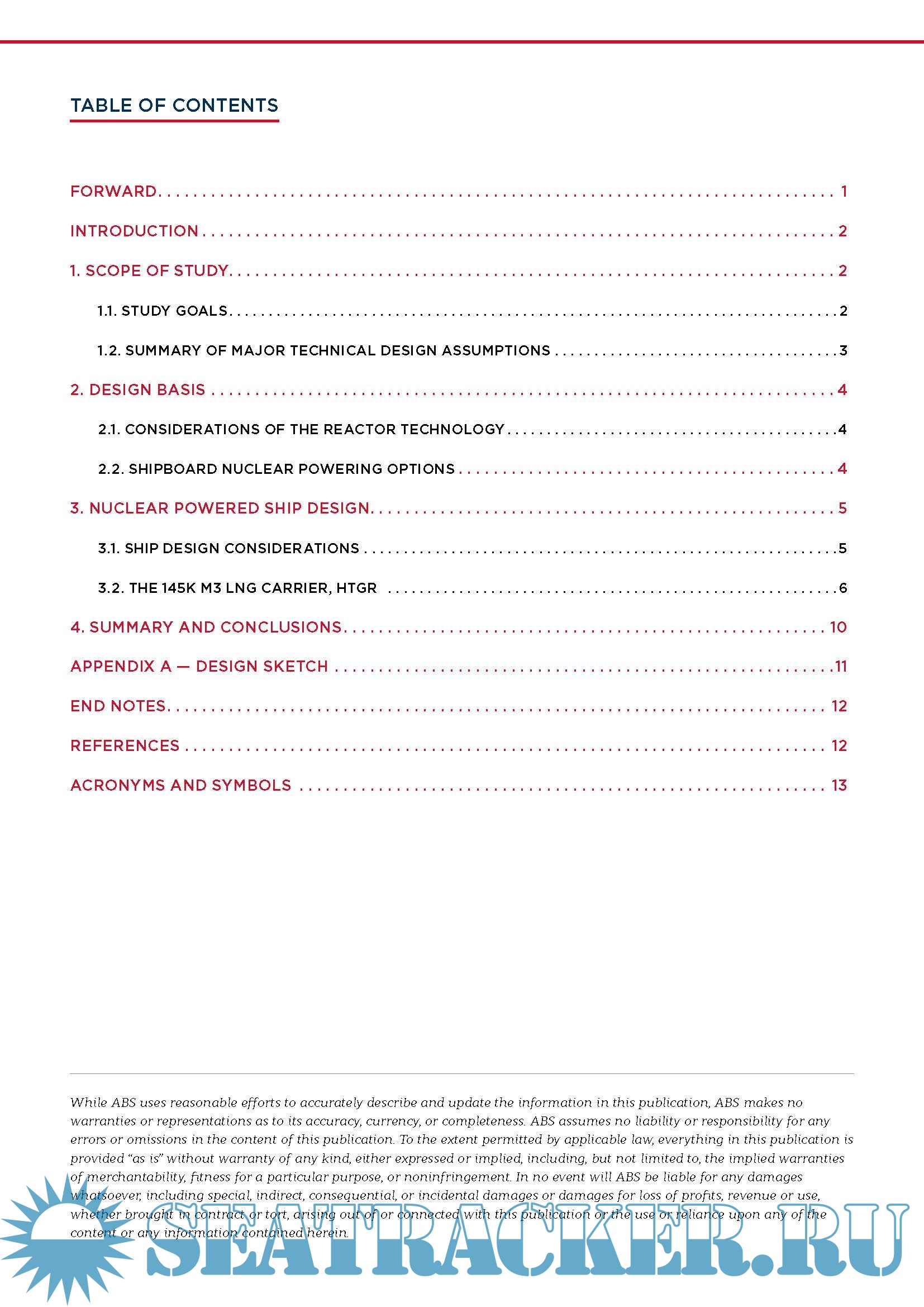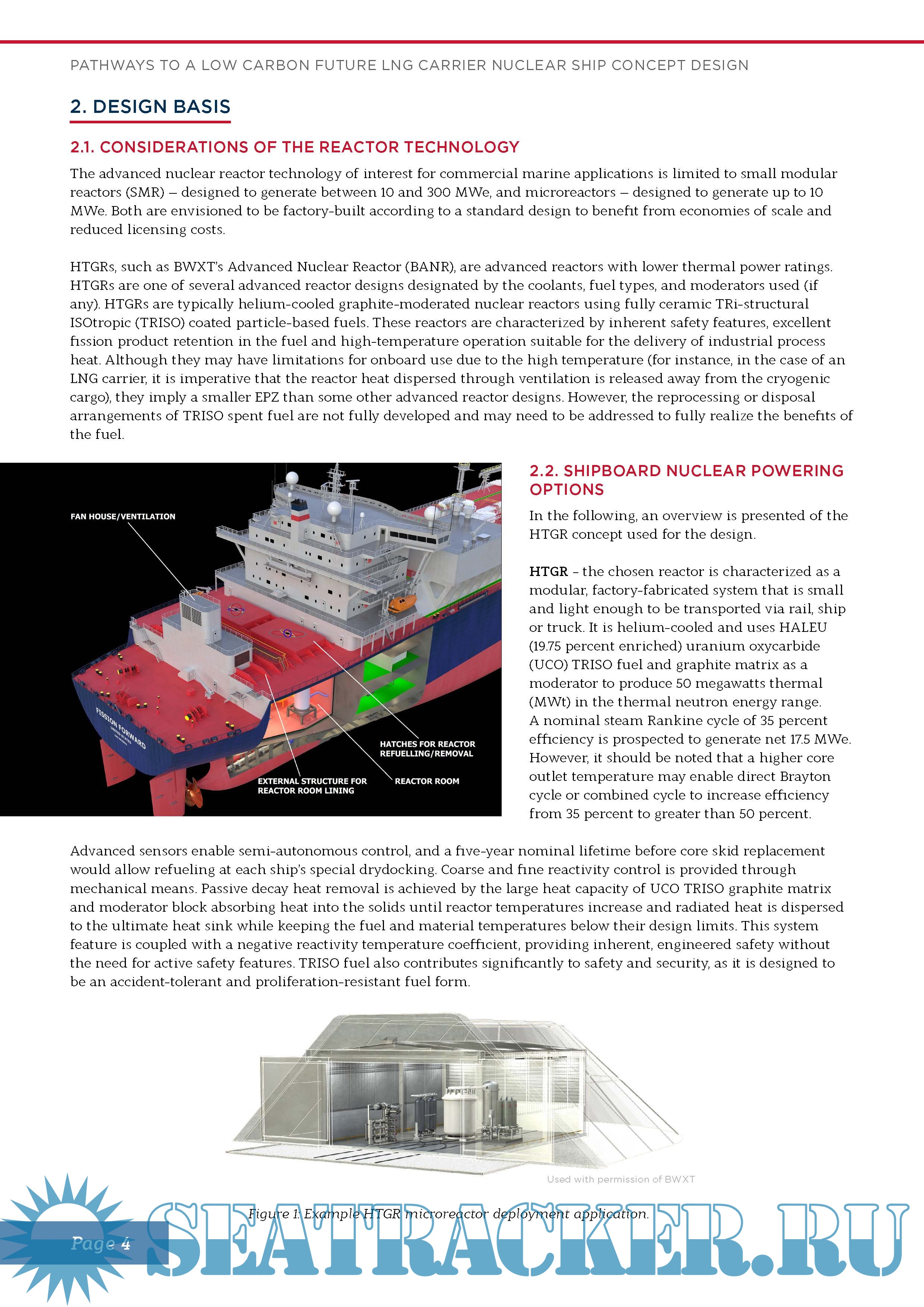 The intended scope of this study is to consider and discuss a standard liquefied natural gas (LNG) carrier design using nuclear power for propulsion and other primary energy needs. The design of this nuclear-powered vessel required several assumptions based on the perceived level of technical readiness and concept of operations that, at this time, are not defined. The reactors used in this concept study are intended for land-based applications.