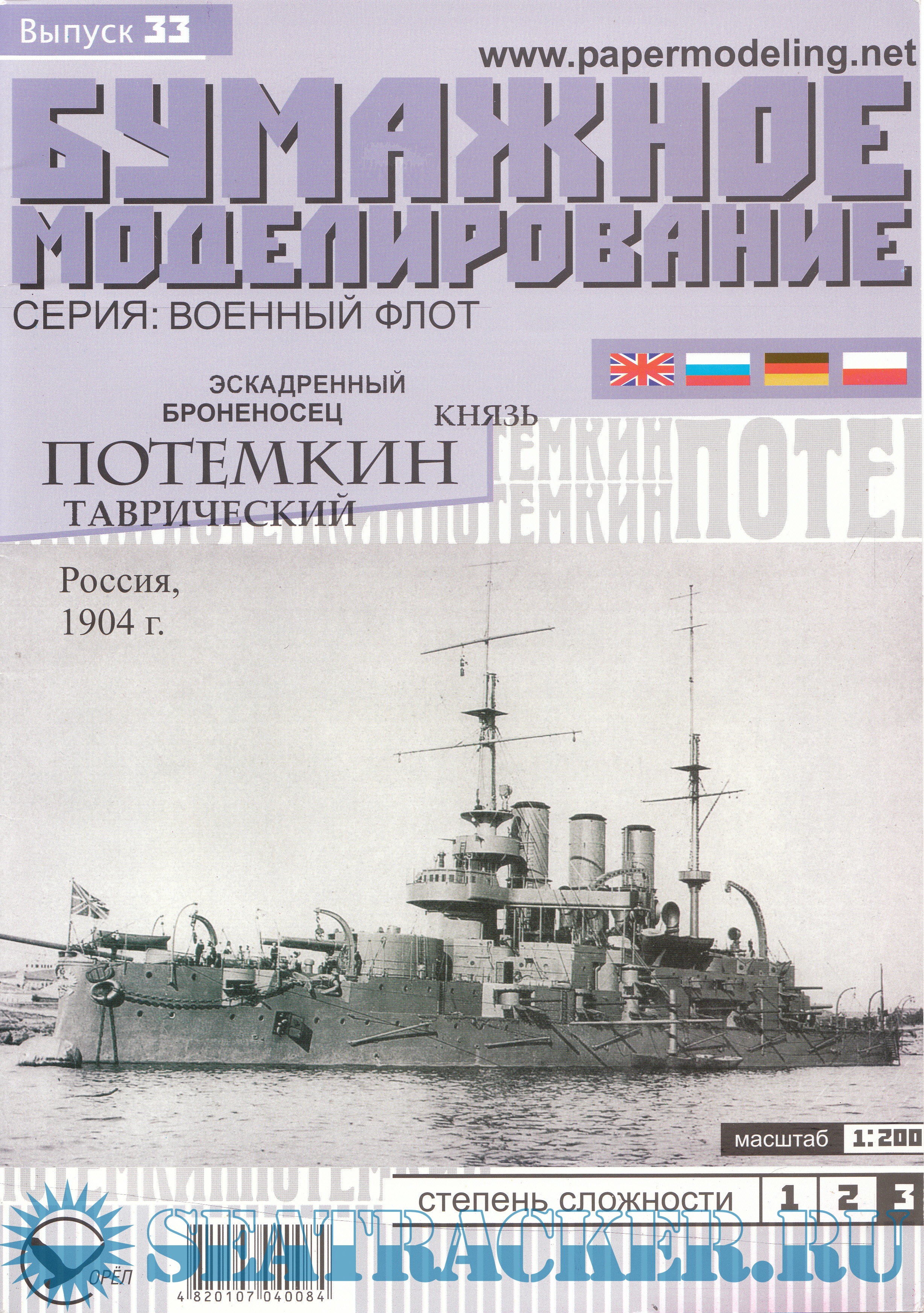 Год выпуска: 2011 Язык: Русский, Английский, Немецкий, Польский Автор: Громык Юрий Жанр: Кто действительно занимается судо- (и не только) моделизмом :) Издание: Бумажное моделирование №33 Формат: JPEG Качество: Изначально компьютерное (eBook) Количество страниц: 36 Описание: 36 листов цветных выкроек и инструкций для изготовления бумажной модели броненосца ''Князь Потёмкин-Таврический'' в масштабе 1:200