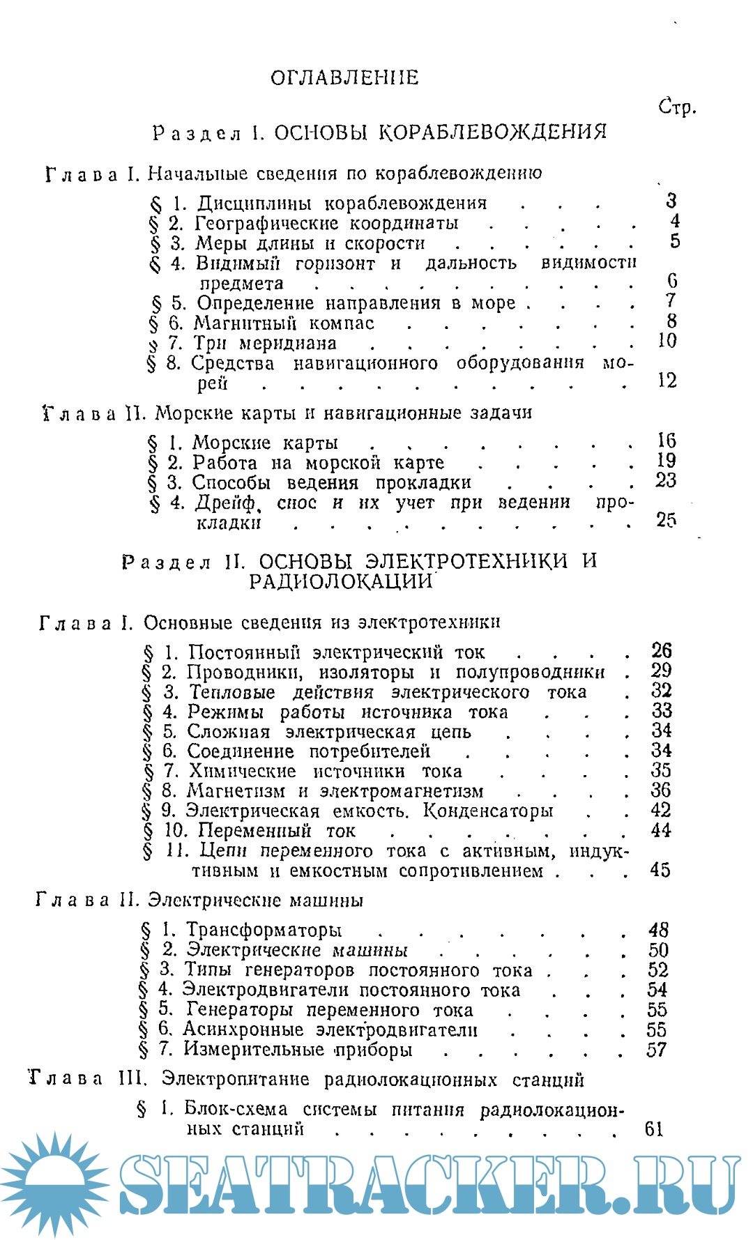 В первом разделе приведены краткие сведения по основам кораблевождения, без знаний которых сложно усвоить назначение и использование штурманских радиолокационных станций. Основы электротехники и радиолокации изложены во втором разделе в виде справочного материала. Главным в пособии является третий раздел — Устройство и эксплуатация радиолокационных станций. В нем излагается принцип работы радиолокационной станции в целом и каждого ее элемента в отдельности, описывается конструкция приемо-передающих, антенно-волноводных и индикаторных устройств, различных агрегатов и приборов. В последующих главах и параграфах приведены материалы по эксплуатации, обслуживанию и боевому применению штурманских радиолокационных станций корабля. Четвертый раздел пособия посвящен вопросам ремонта радиолокационных станций.
