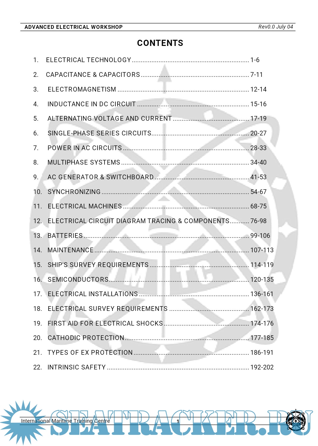 1. ELECTRICAL TECHNOLOGY .................................................................. 1-6 2. CAPACITANCE & CAPACITORS ............................................................. 7-11 3. ELECTROMAGNETISM .......................................................................... 12-14 4. INDUCTANCE IN DC CIRCUIT ............................................................... 15-16 5. ALTERNATING VOLTAGE AND CURRENT ........................................... 17-19 6. SINGLE-PHASE SERIES CIRCUITS....................................................... 20-27 7. POWER IN AC CIRCUITS ....................................................................... 28-33 8. MULTIPHASE SYSTEMS ........................................................................ 34-40 9. AC GENERATOR & SWITCHBOARD ..................................................... 41-53 10. SYNCHRONIZING ................................................................................... 54-67 11. ELECTRICAL MACHINES ....................................................................... 68-75 12. ELECTRICAL CIRCUIT DIAGRAM TRACING & COMPONENTS........... 76-98 13. BATTERIES ............................................................................................. 99-106 14. MAINTENANCE ....................................................................................... 107-113 15. SHIP'S SURVEY REQUIREMENTS ........................................................ 114-119 16. SEMICONDUCTORS............................................................................... 120-135 17. ELECTRICAL INSTALLATIONS .............................................................. 136-161 18. ELECTRICAL SURVEY REQUIREMENTS ............................................. 162-173 19. FIRST AID FOR ELECTRICAL SHOCKS ................................................ 174-176 20. CATHODIC PROTECTION ...................................................................... 177-185 21. TYPES OF EX PROTECTION ................................................................. 186-191 22. INTRINSIC SAFETY ................................................................................ 192-202