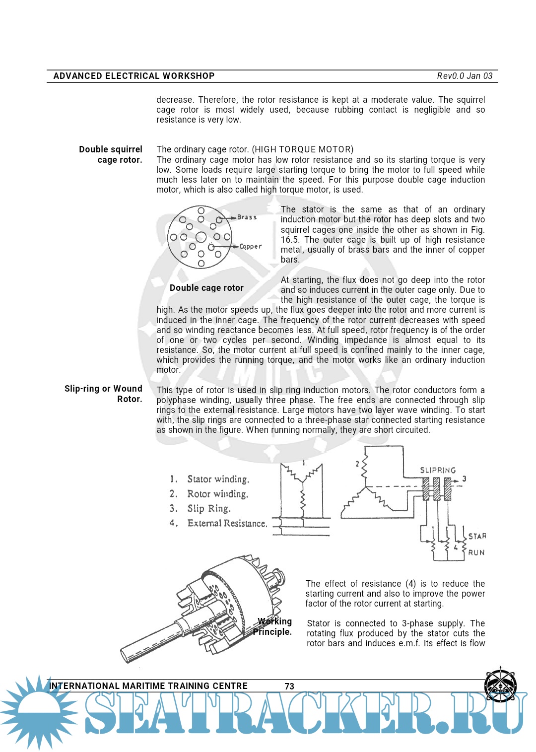 Year: 2004 Language: English Author: Maersk Genre: Training courses Publisher: International Maritime Training Centre - Wilhelmsen Format: PDF Quality: eBook Pages count: 205 Description: The workshop provides in-depth training on various electrical systems and troubleshooting techniques essential for marine engineers. It focuses on improving participants' confidence and competence in handling and analyzing electrical circuits, components, and systems. Course Objectives: - Understand the fundamental principles of electrical technology. - Identify and interpret electrical symbols, components, and their functions. - Learn to trace and troubleshoot complex electrical circuits logically. - Gain hands-on experience with advanced electrical systems and equipment. Theoretical: - Alternating current (A.C.) fundamentals and generator operations. - Power generation and parallel generator operations. - Maintenance of air circuit breakers and hazardous zones. - Motors, starters (including DOL, reduced voltage, and variable frequency drives), and soft starters. - Secondary battery maintenance and cathodic protection. Practical: - Use of diagnostic tools like multimeters and meggers. - Hands-on experience with contactors, relays, and timers. - Wiring and troubleshooting of various starters (DOL, star-delta, etc.). - Advanced troubleshooting on boiler control panels and other shipboard electrical systems. Duration: - 4 to 6 days, depending on the specific course structure. Target Audience: - Marine engineers, electrical officers, and related professionals seeking to improve their expertise in electrical systems.