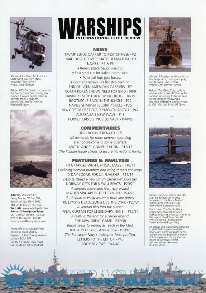 Description: Warships IFR puts the spotlight on the latest developments in the world’s navies. It covers current defence issues and has comments by leading analysts. The magazine regularly includes features on the Royal Navy and the US Navy in addition to incorporating news and features on all other navies across the globe. Warships IFR frequently carries in-depth articles on naval heritage.WARSHIPS International Fleet Review is published 12 times a year by Tandy Media Ltd who also publish Shipping Today & Yesterday (which provides news and features from the world of merchant shipping).