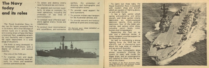 Description: The first editions of Navy Today were published in the early 1960s to provide a snapshot of the contemporary RAN Fleet and a brief commentary on operations in which the RAN was involved. The booklets were distributed by Navy Public Relations and through Navy Recruiting centres around Australia and were produced in various formats until the mid 1990s at which time web-based technology took over.