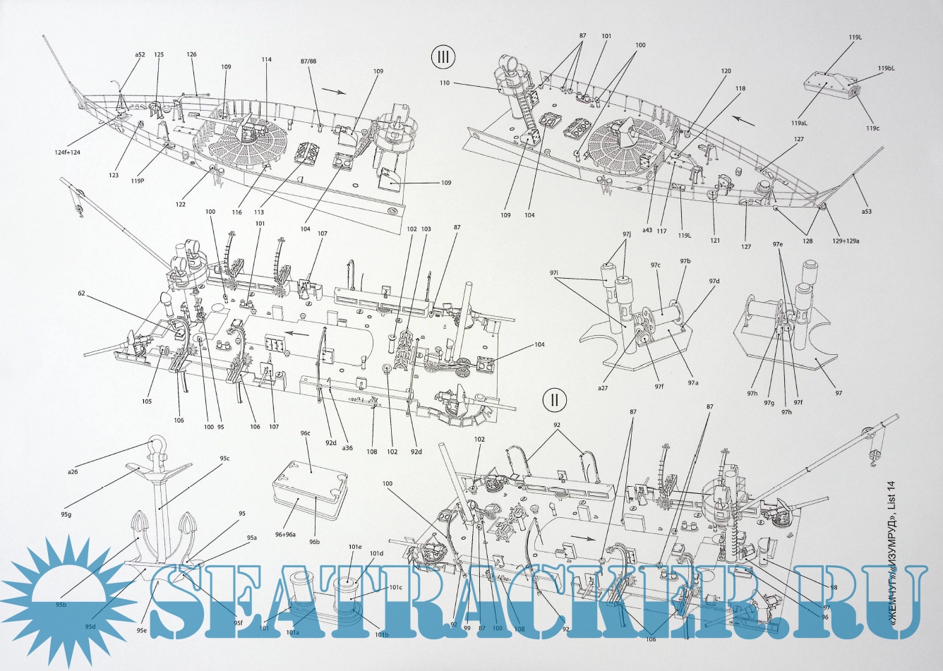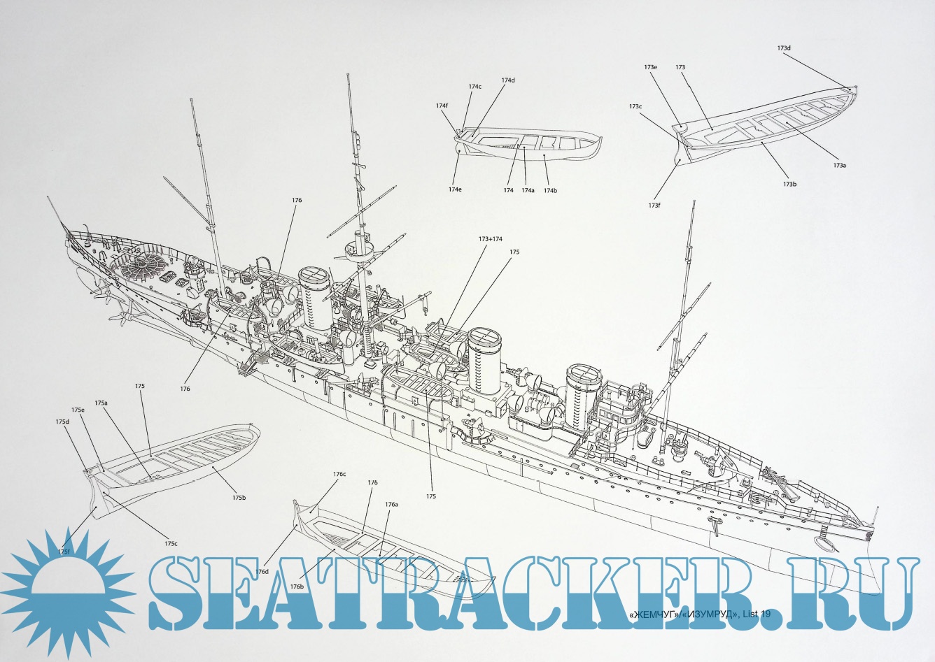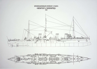 Описание: 22 листа цветных выкроек и инструкций для изготовления бумажной модели бронепалубного крейсера «Жемчуг» или «Изумруд» 1905 г. в масштабе 1:200